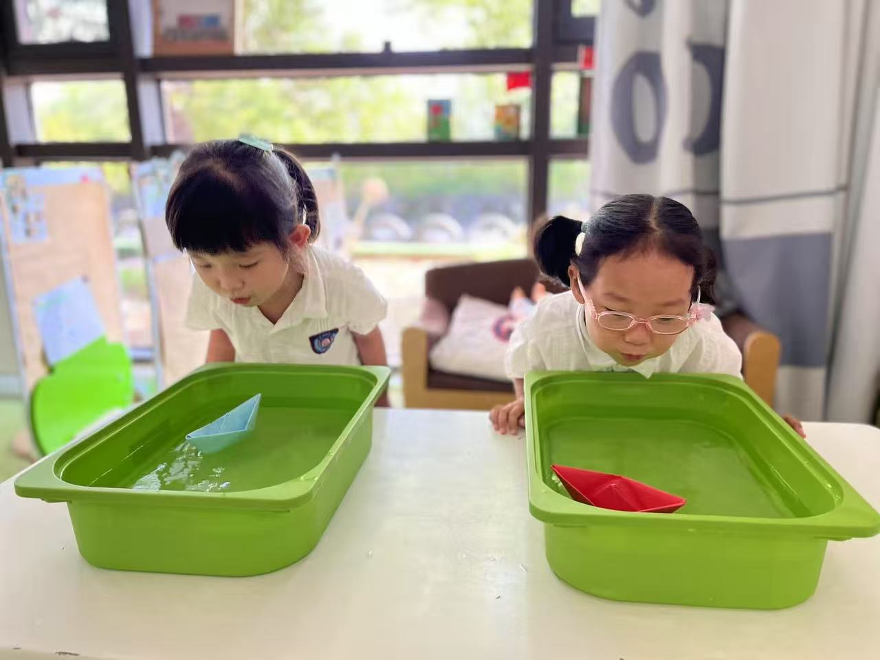 用纸折出两只小船,放进盛好水的盆里,和孩子一起比赛“吹着船”,看看谁的小船先到终点。这个玩法不仅能吸引孩子,还能锻炼到孩子的口肌能力,帮助孩子更好的发音。