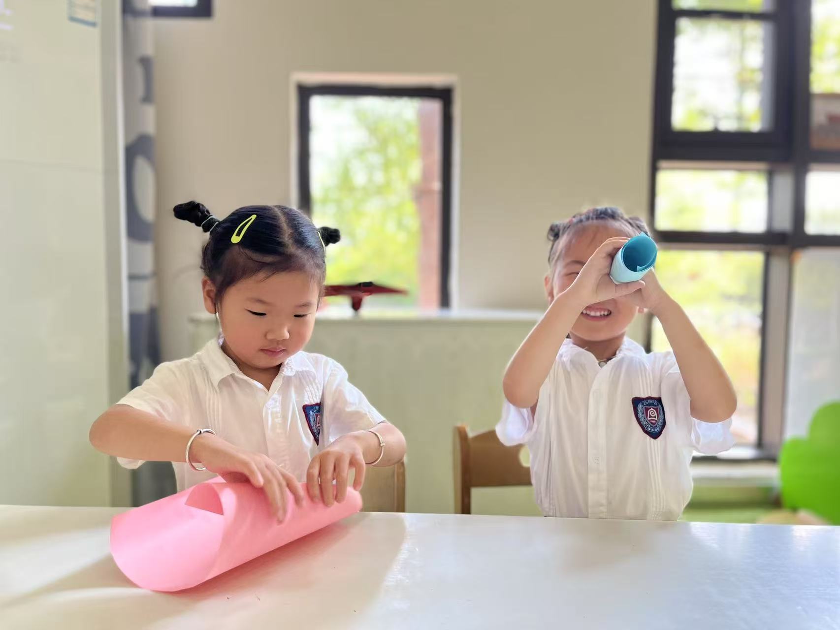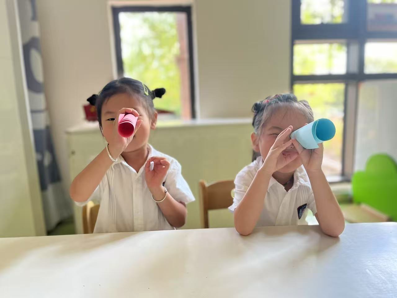 把纸卷起来,假装是望远镜,然后和孩子一起通过望远镜,去观察周围的物品。看到什么就跟孩子说什么,如我看到了沙发,这里是窗帘,前面还有一个娃娃等。