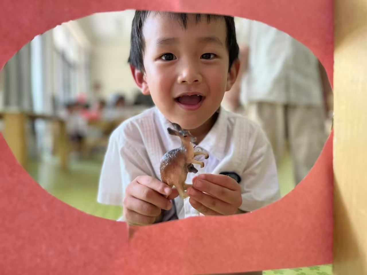 在纸的中央,剪出一个大洞 然后固定在桌沿上,和孩子站在离纸圈一步远的位置,把小玩偶扔进圈里,假装动物在跳圈。玩这个游戏,记得一定要加入夸张的表演,如果成功扔进去,我们可以激动的跳起来,或者和孩子同时说“跳进去啦,成功了!”如果没有扔进去,你们要夸张的表现出懊恼的感觉,“哎呀,失败了”,没扔进去的过程中,也可以配音“怎么还是不中呀?”等。