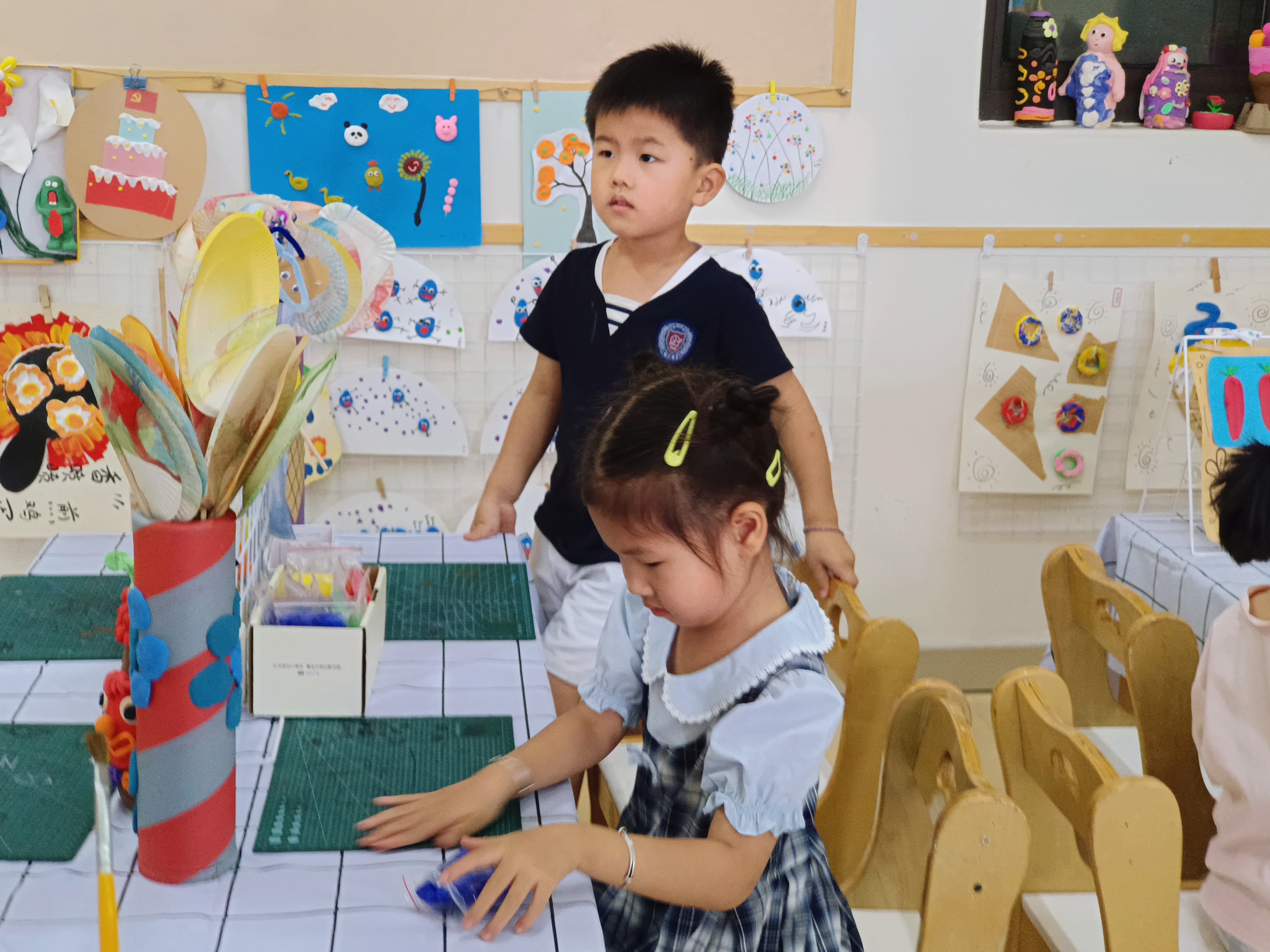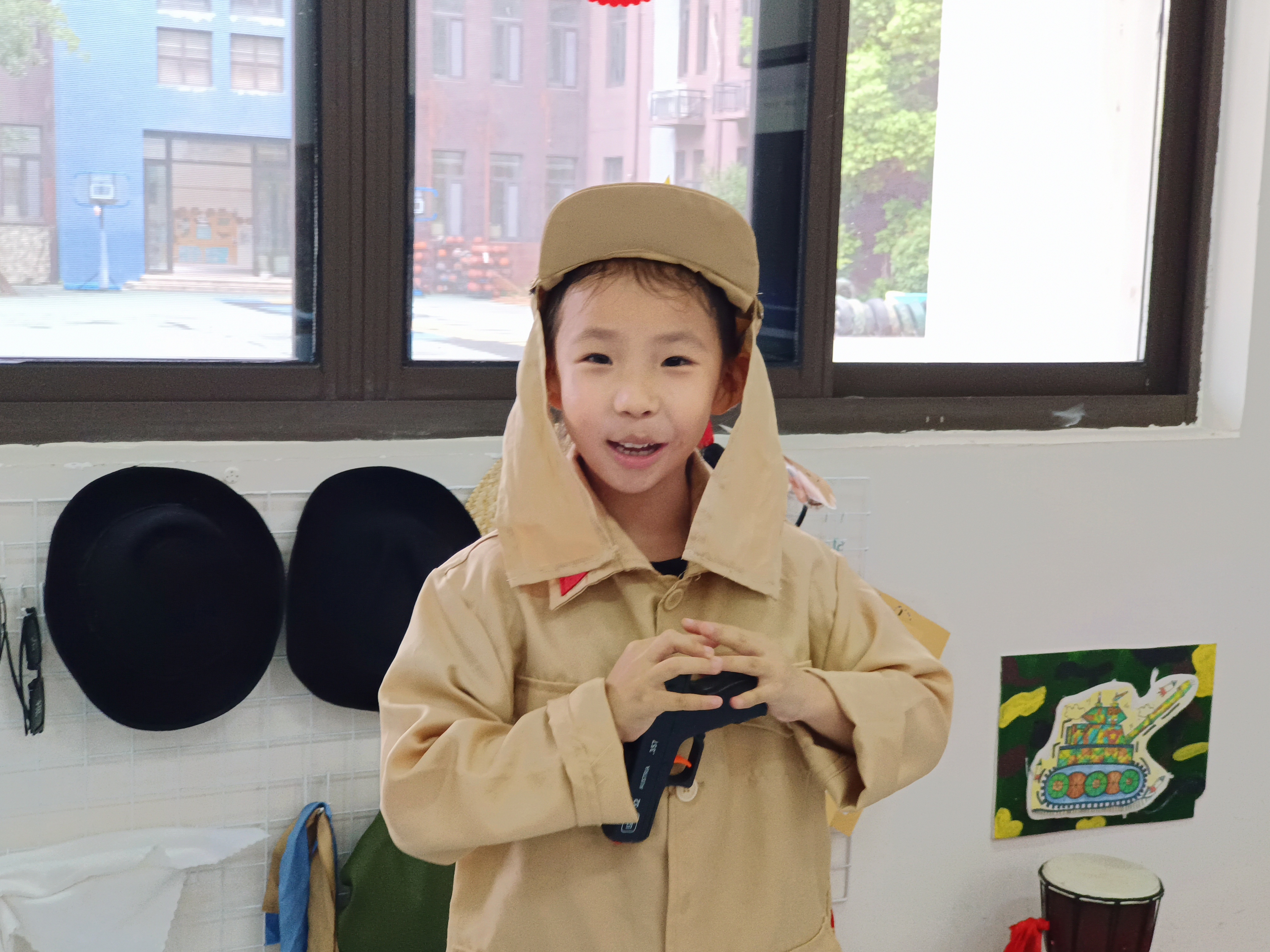 走到亲子戏剧区,“小小解放军和小小日本兵“沉浸式演绎红色戏剧,领导同步建议补充不同职业场景道具,让角色体验更立体 。在创艺生活区,小女孩对着画纸认真创作,桌上彩笔、半成品错落,领导驻足欣赏,鼓励教师多展示作品创作过程,让 “美” 成为思维探索记录 。