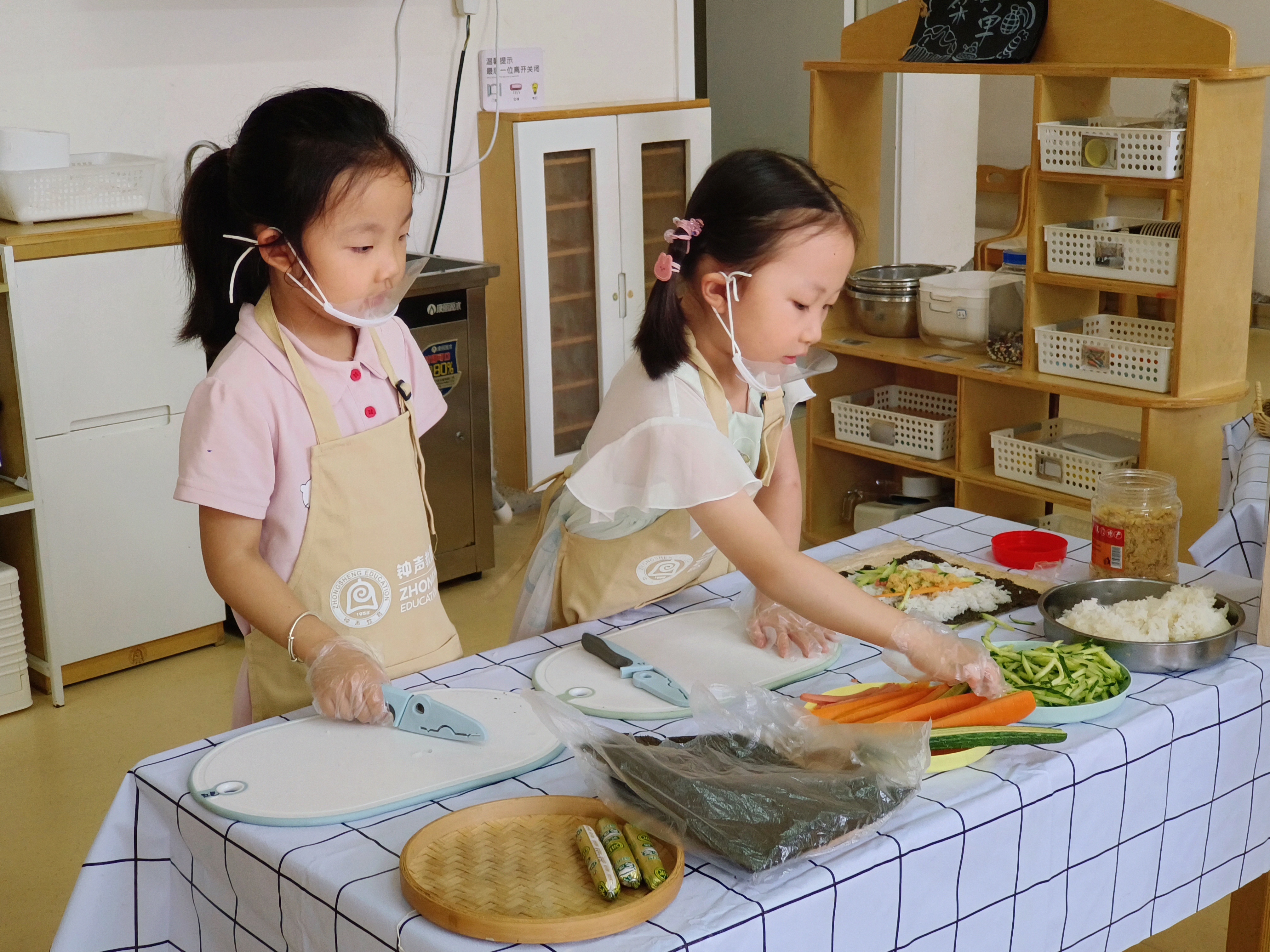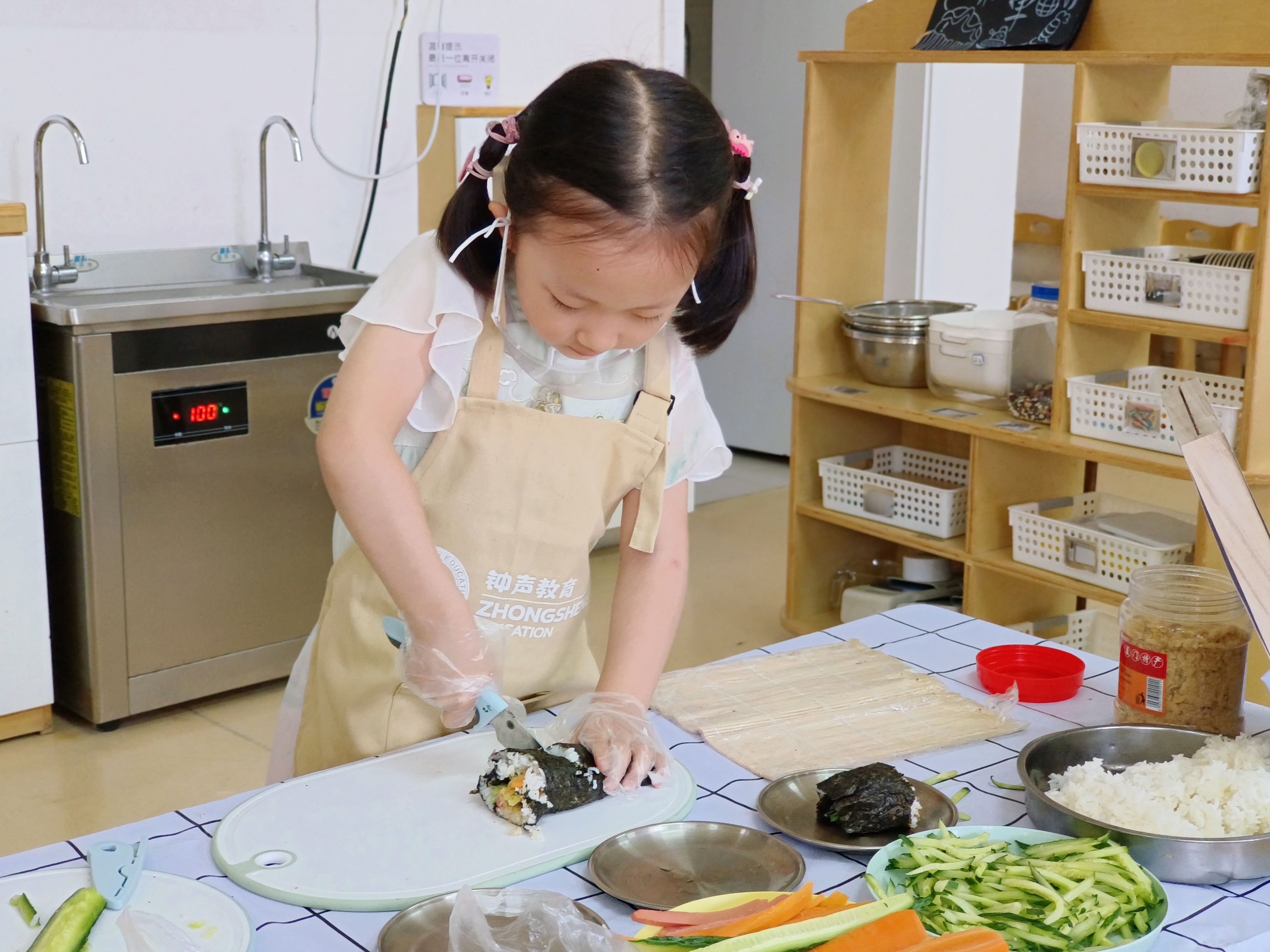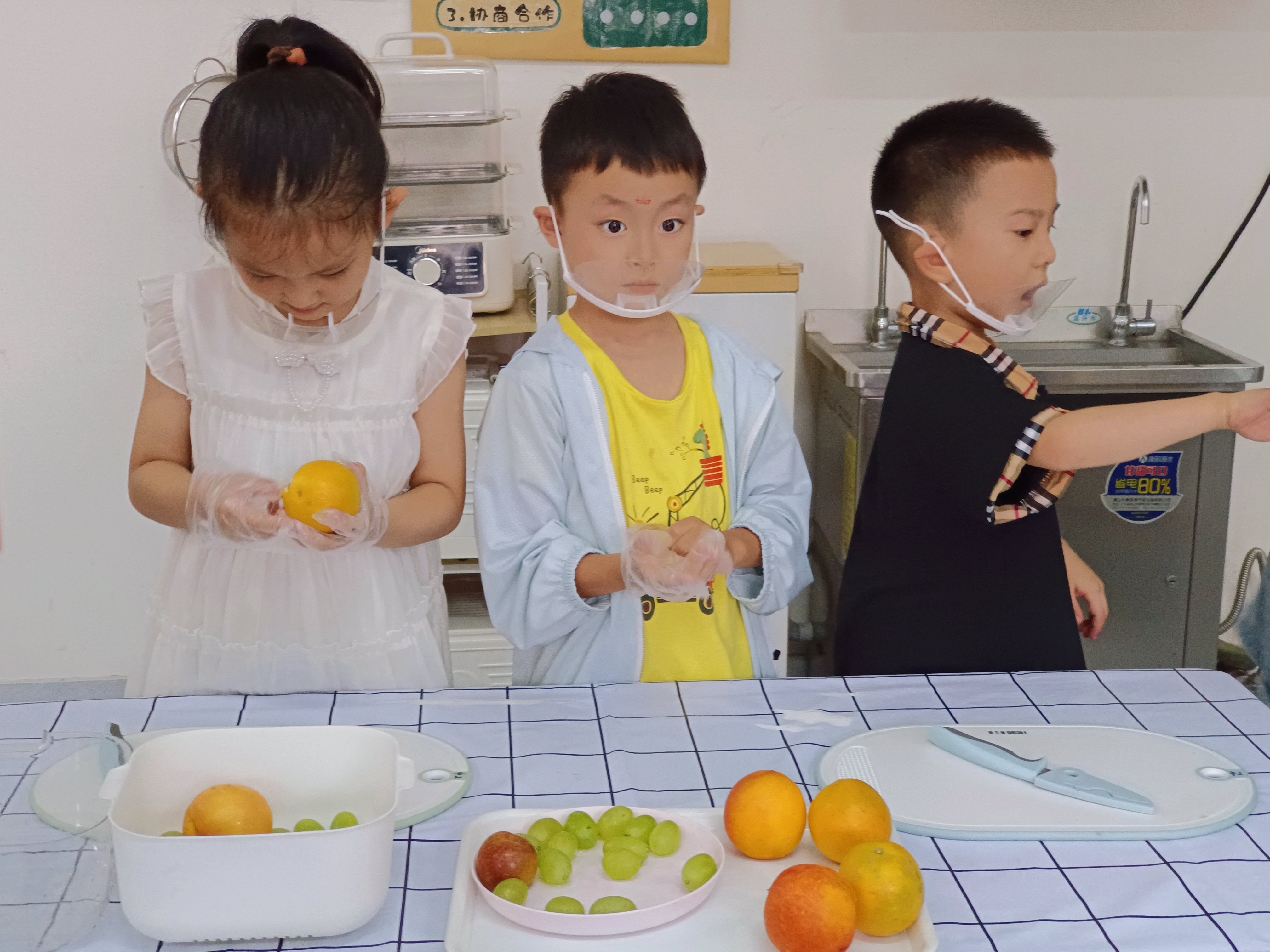 近日,我园开展区域教研专项指导活动。领导们一踏入班级,便被热闹而有序的氛围所吸引。在悦食乐动区,孩子们戴着手套,正专注地处理水果:从小心揉搓橙子,到尝试用工具辅助加工,一举一动都透着认真。领导们轻声询问活动流程,对这些小厨师的动手能力连连点赞,同时建议教师可增加“食材搭配小知识”讲解,让孩子们的体验更有深度。