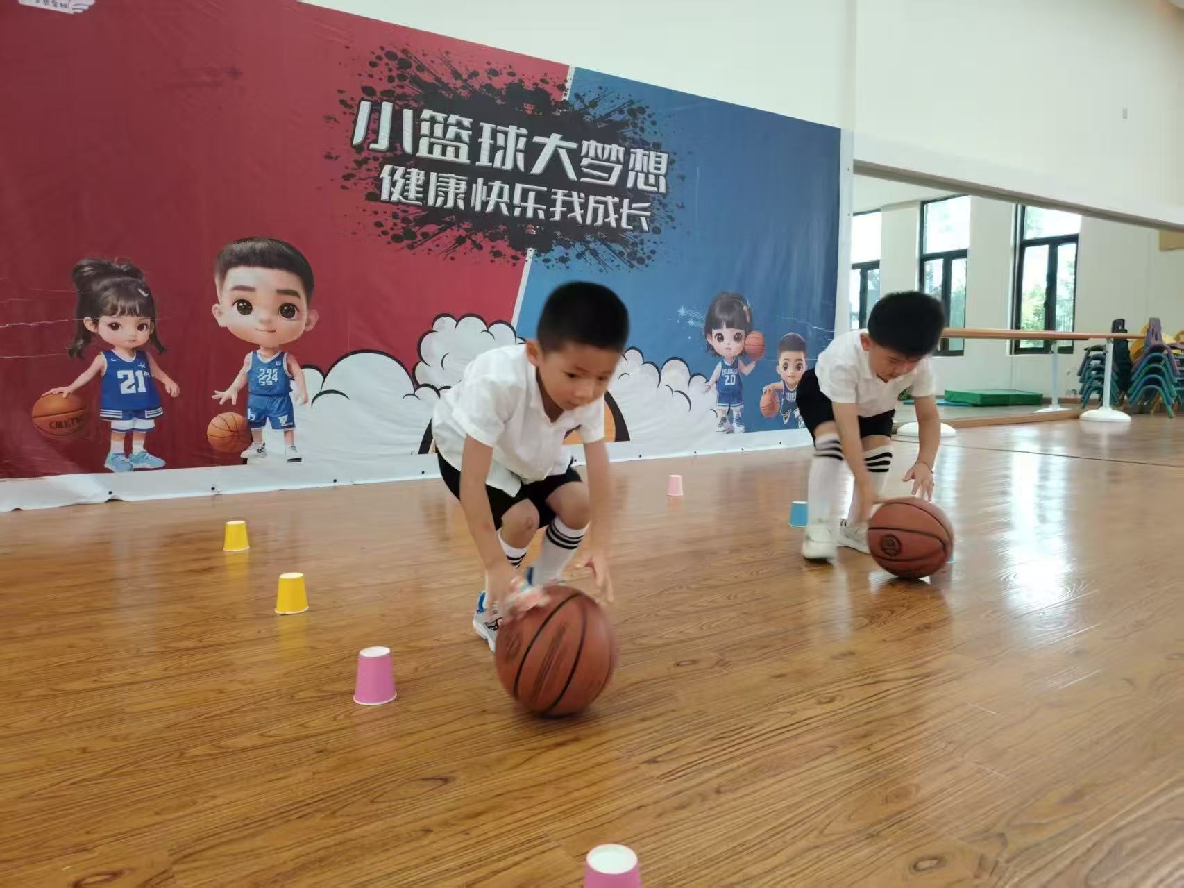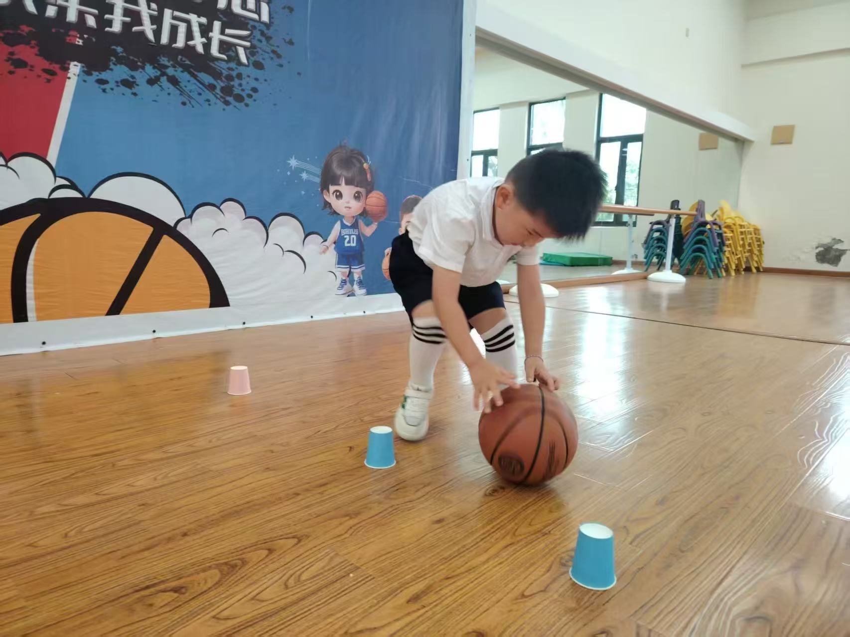 材料准备:杯子10~15个,海洋球多个,篮球1个。