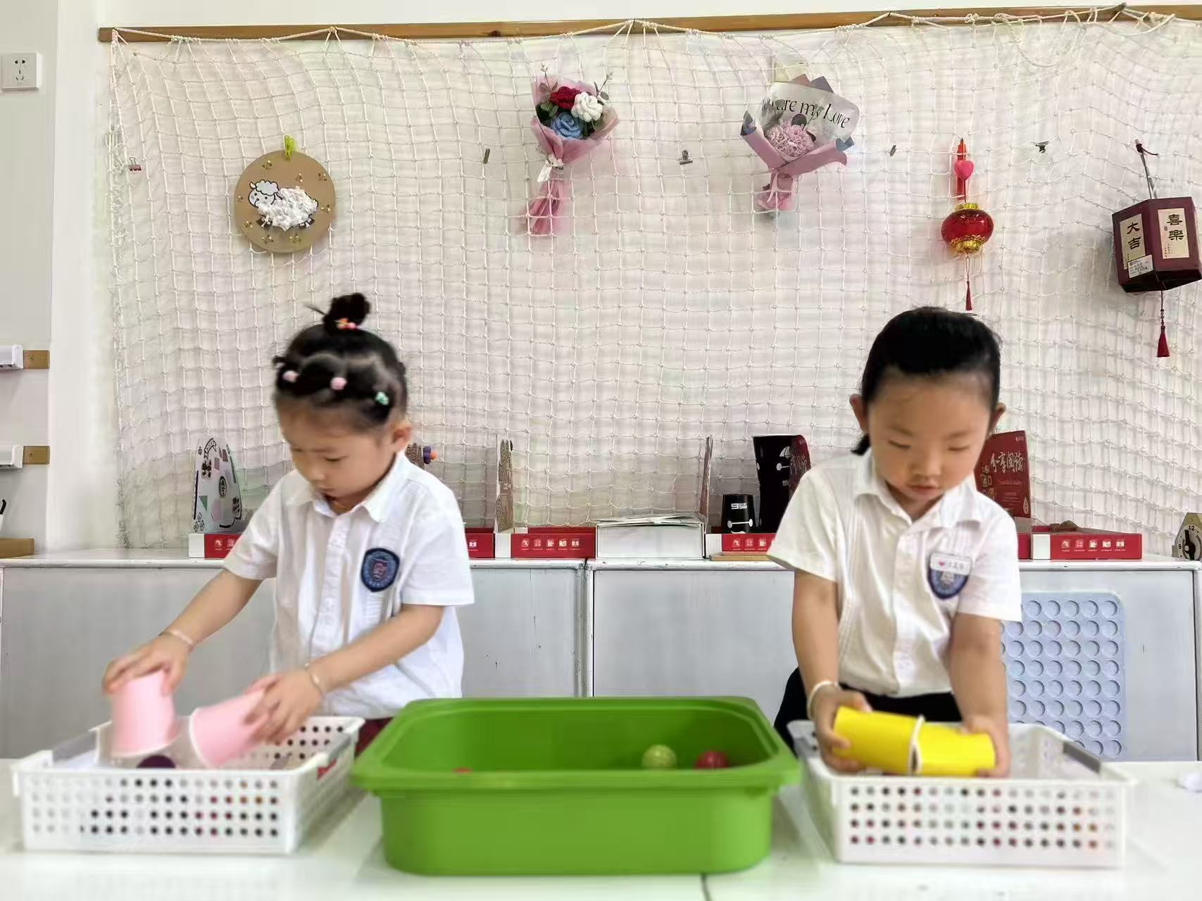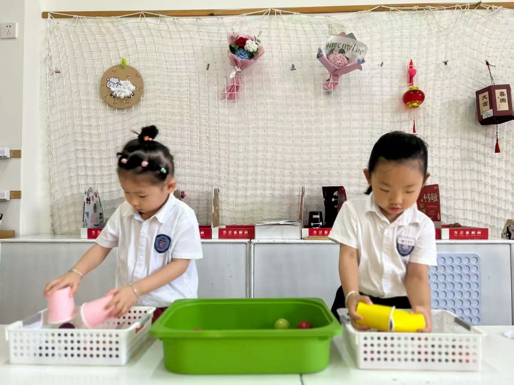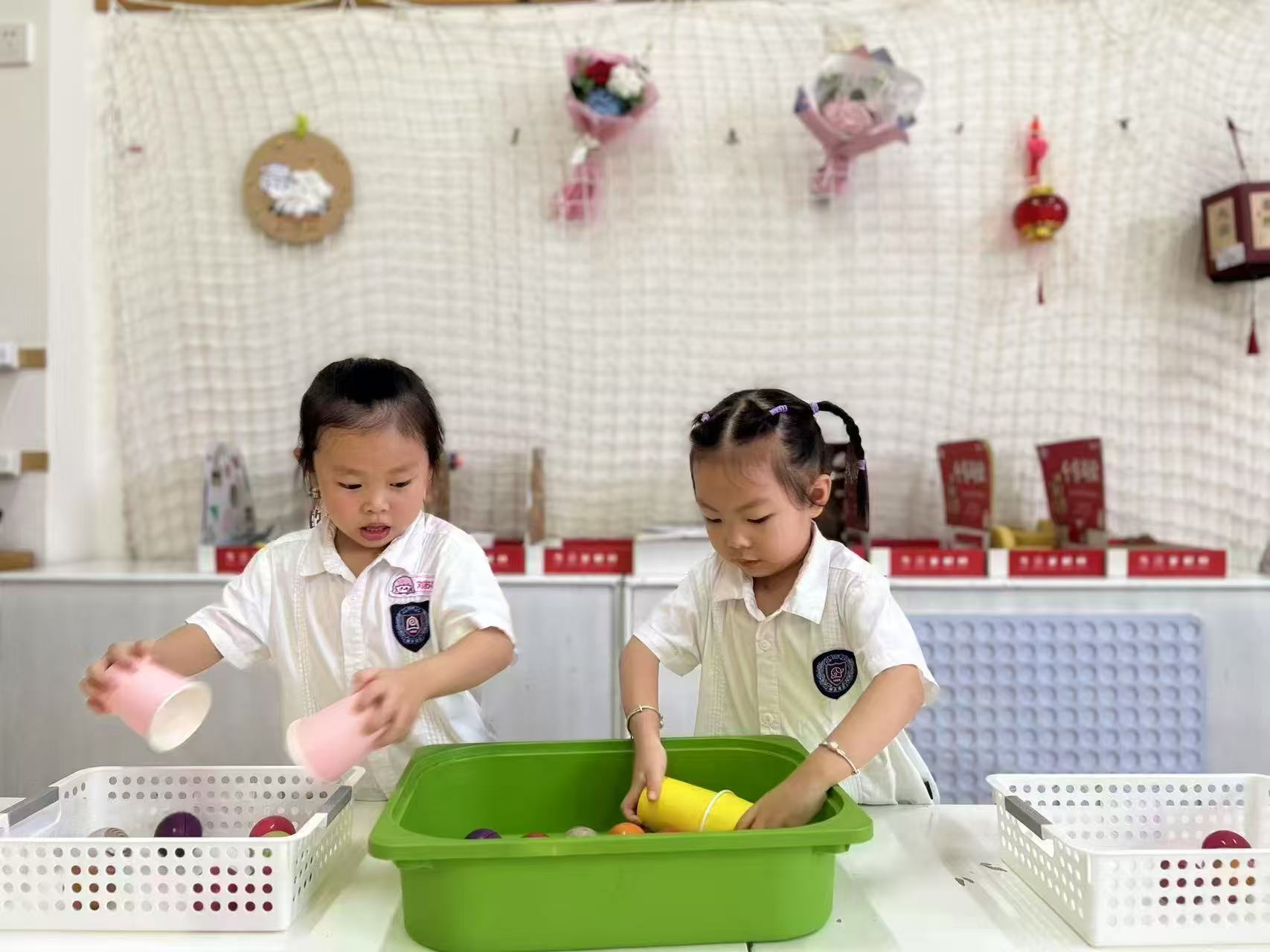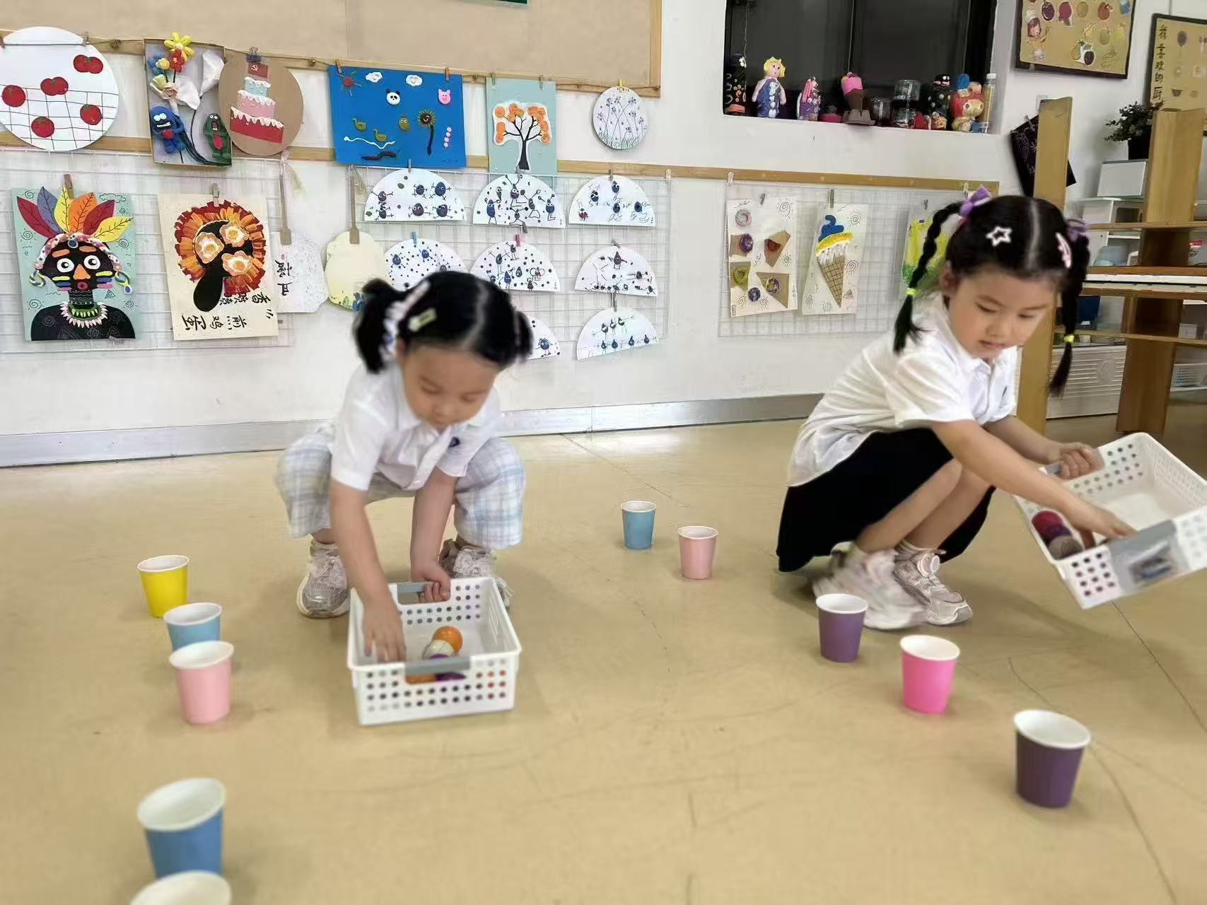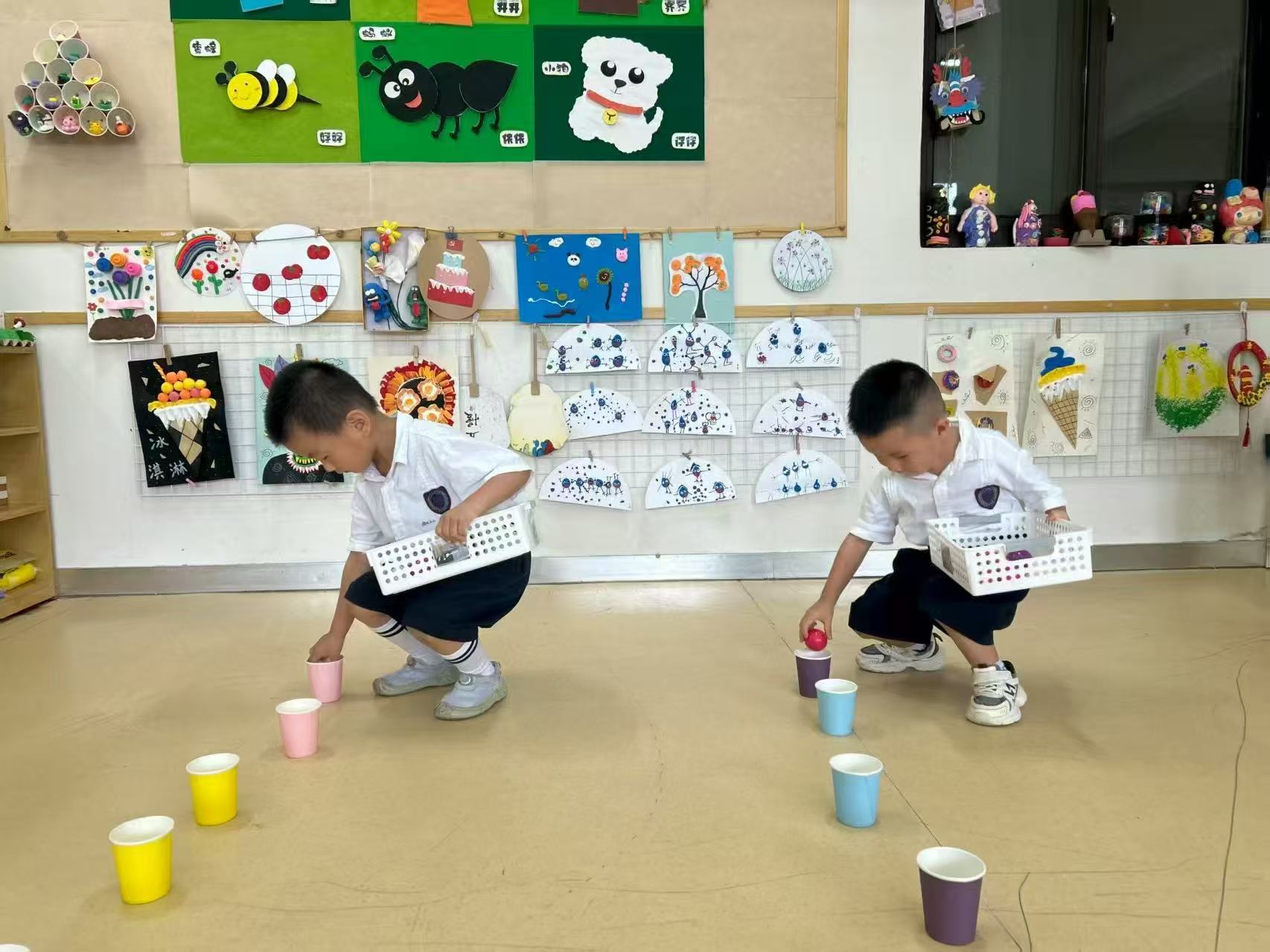 小朋友双手各拿一个纸杯,双手配合将大小不一的海洋球夹住,运送至小筐中。然后两个小朋友进行比赛,看谁运的海洋球最多。这个夹球进筐游戏发展小盆友手部力量和手的控制力。