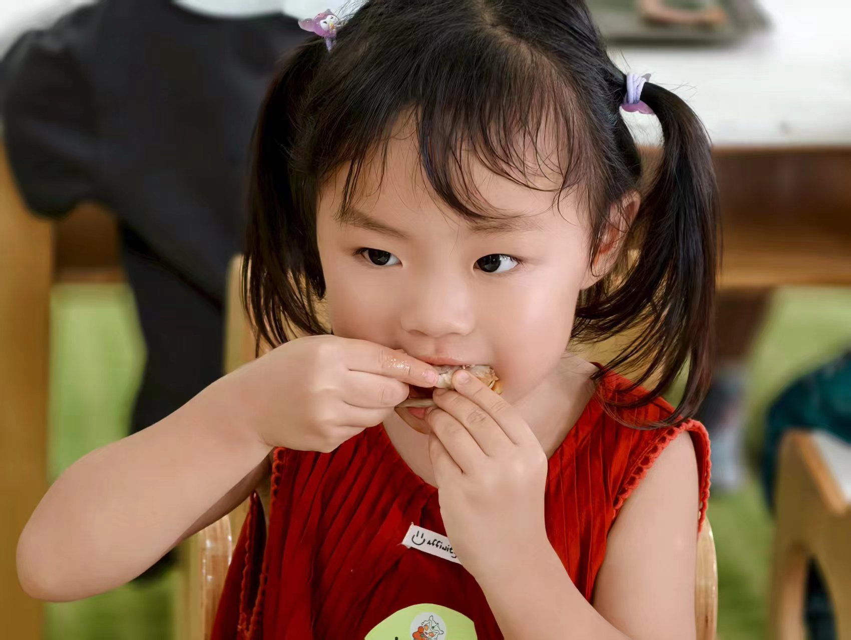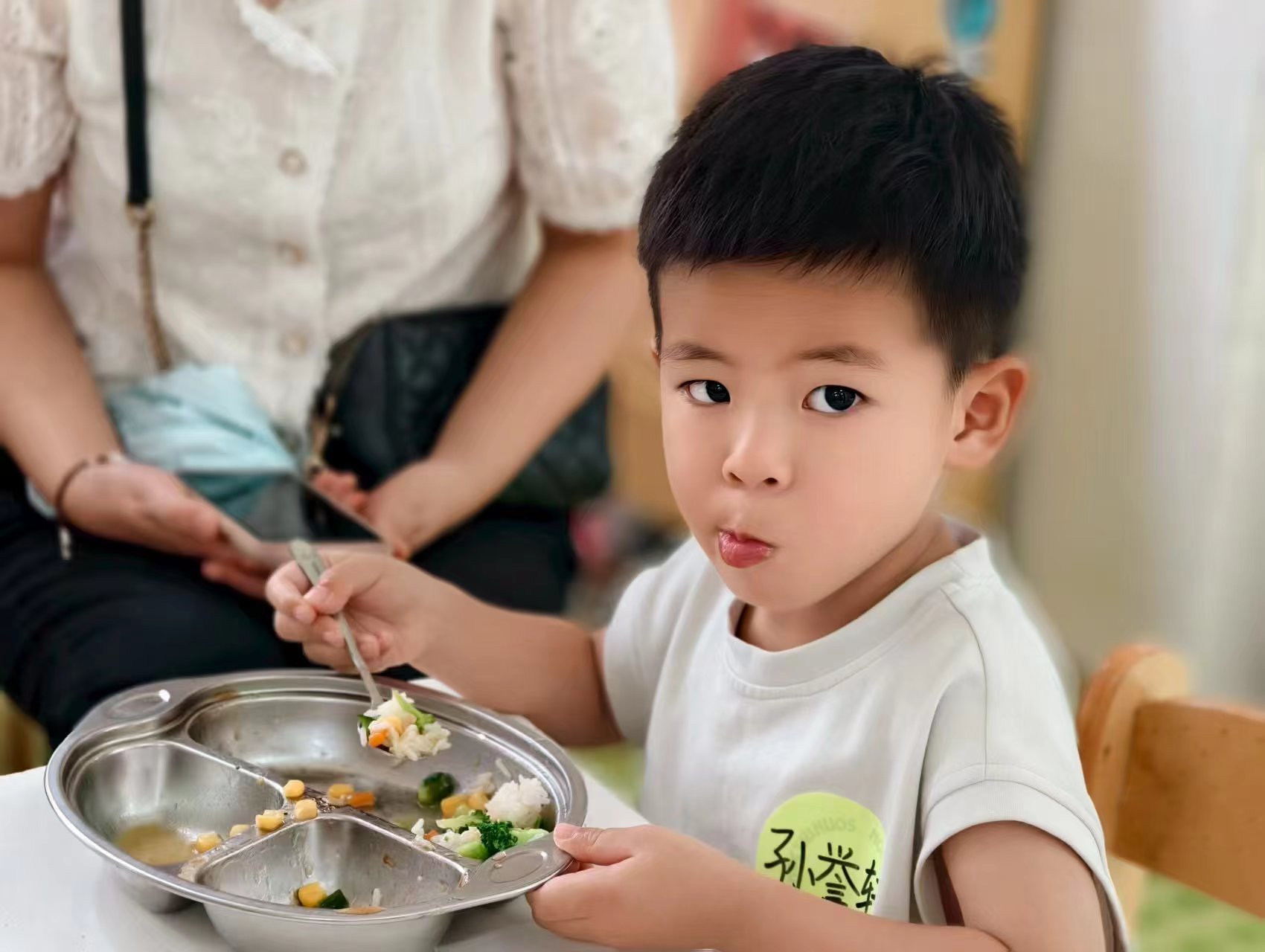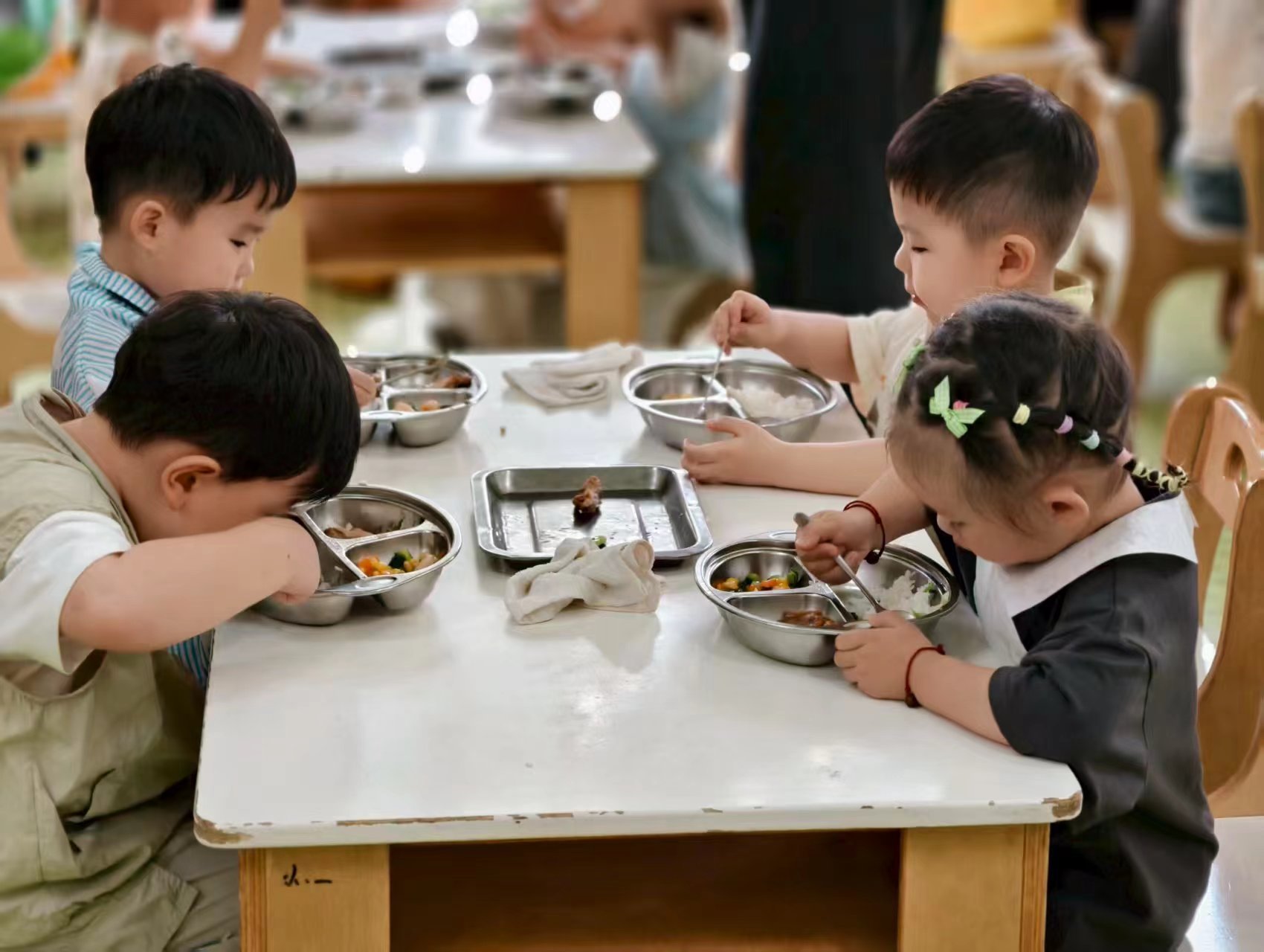 幼儿园为孩子们准备了美味可口的午饭,瞧,孩子们吃得多香!