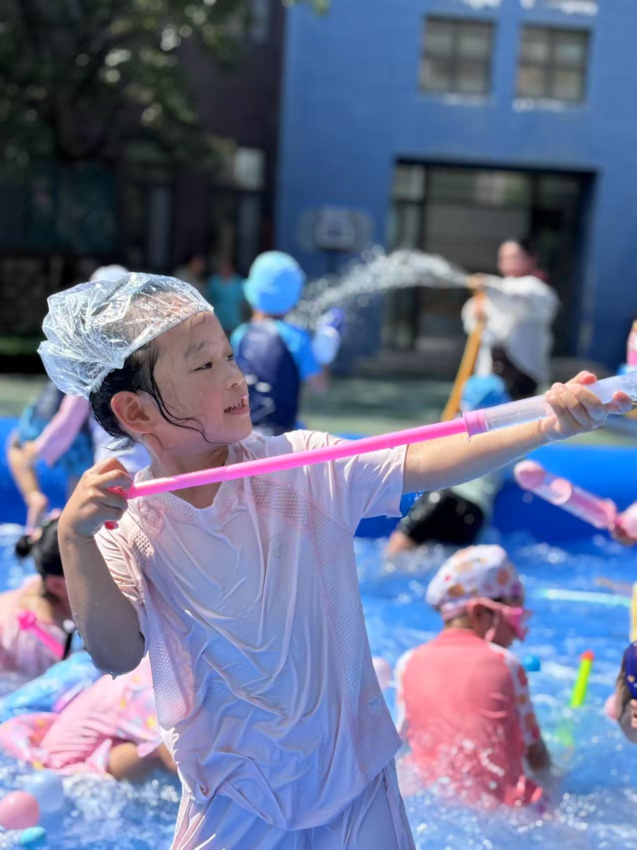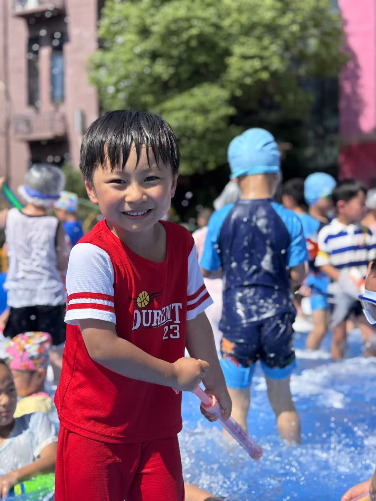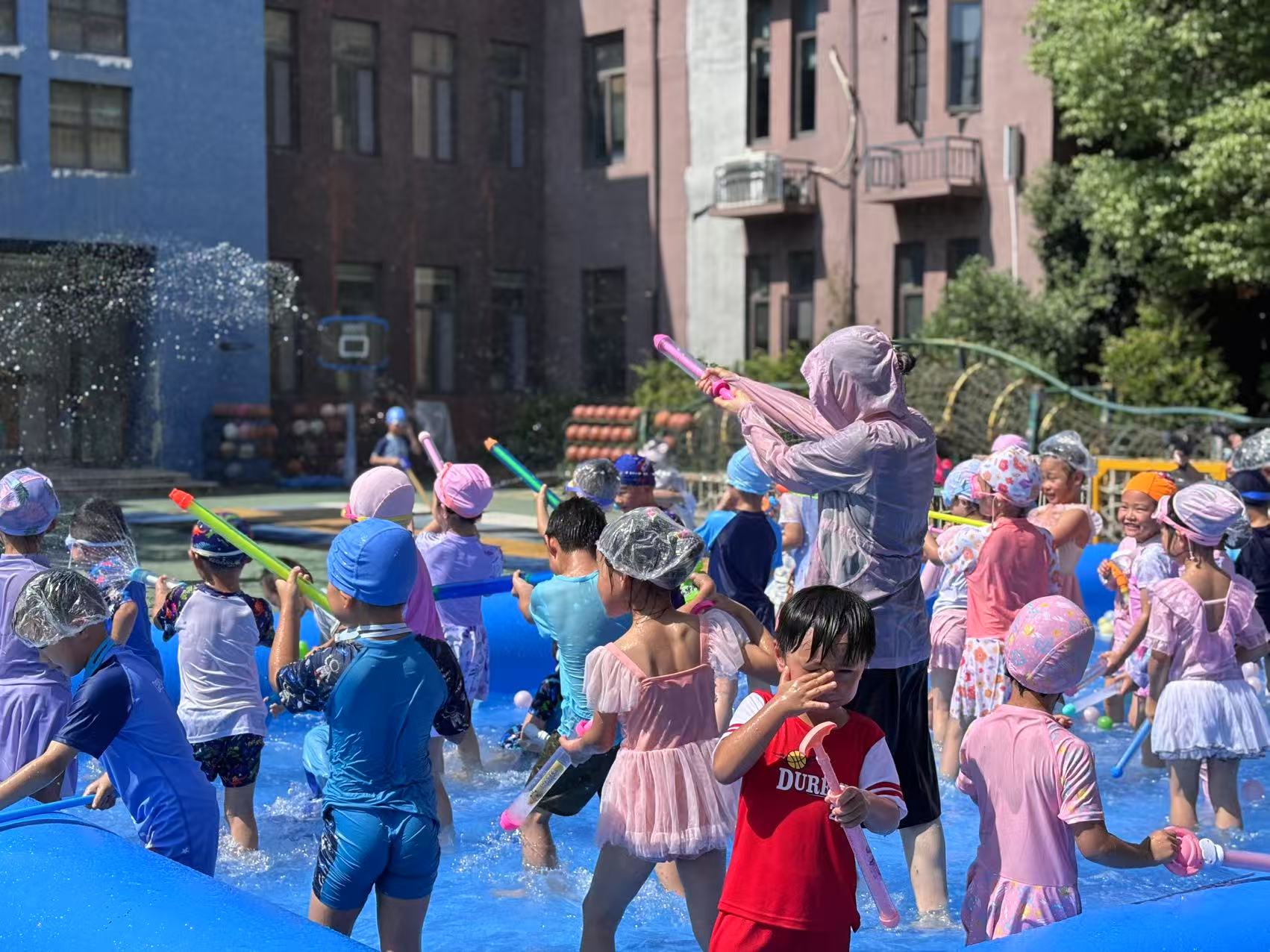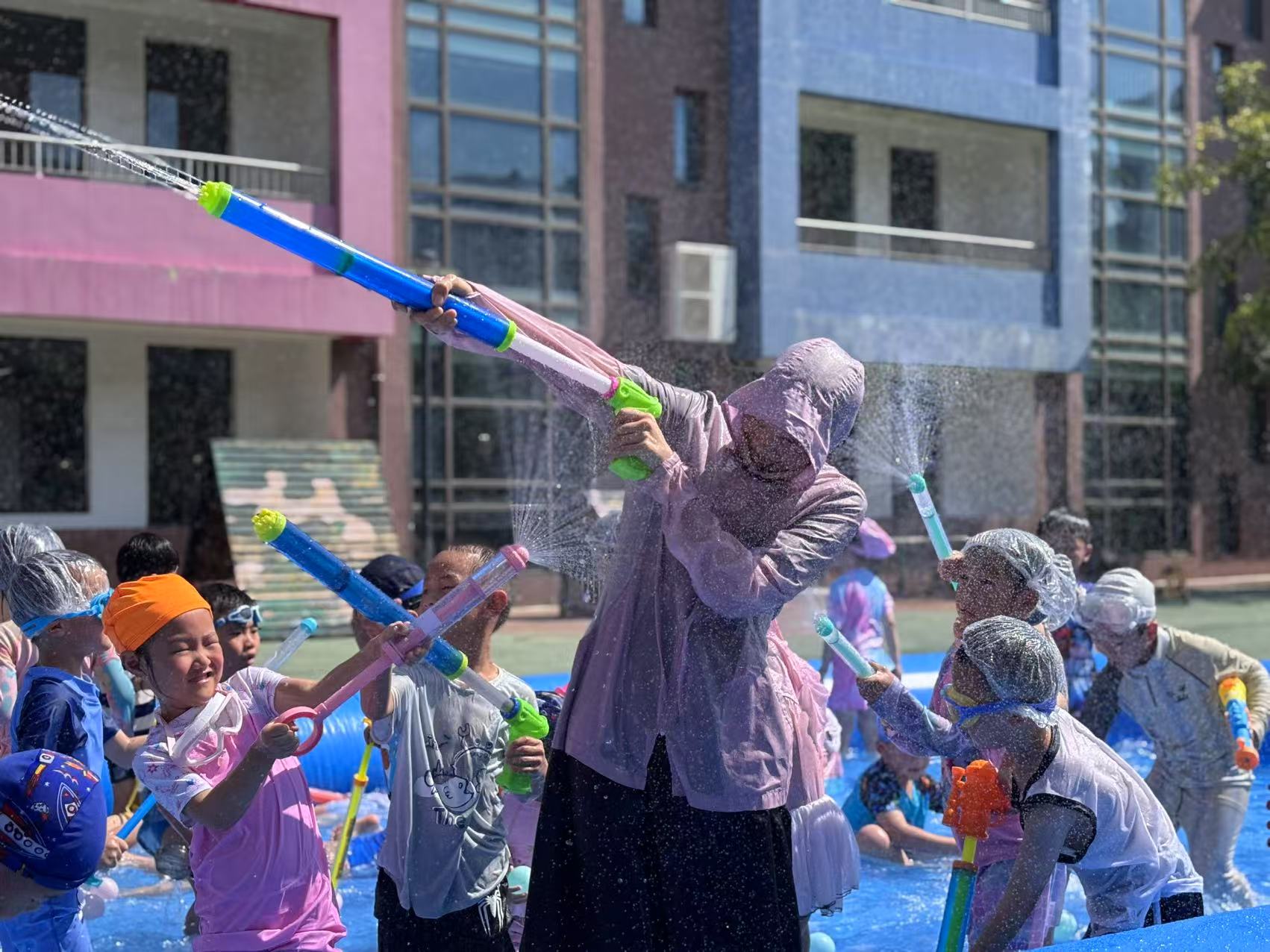 幼儿园变成了一片欢乐的海洋,一支支水枪“火力全开”,现场活动气氛如这夏日的温度一样持续高升。