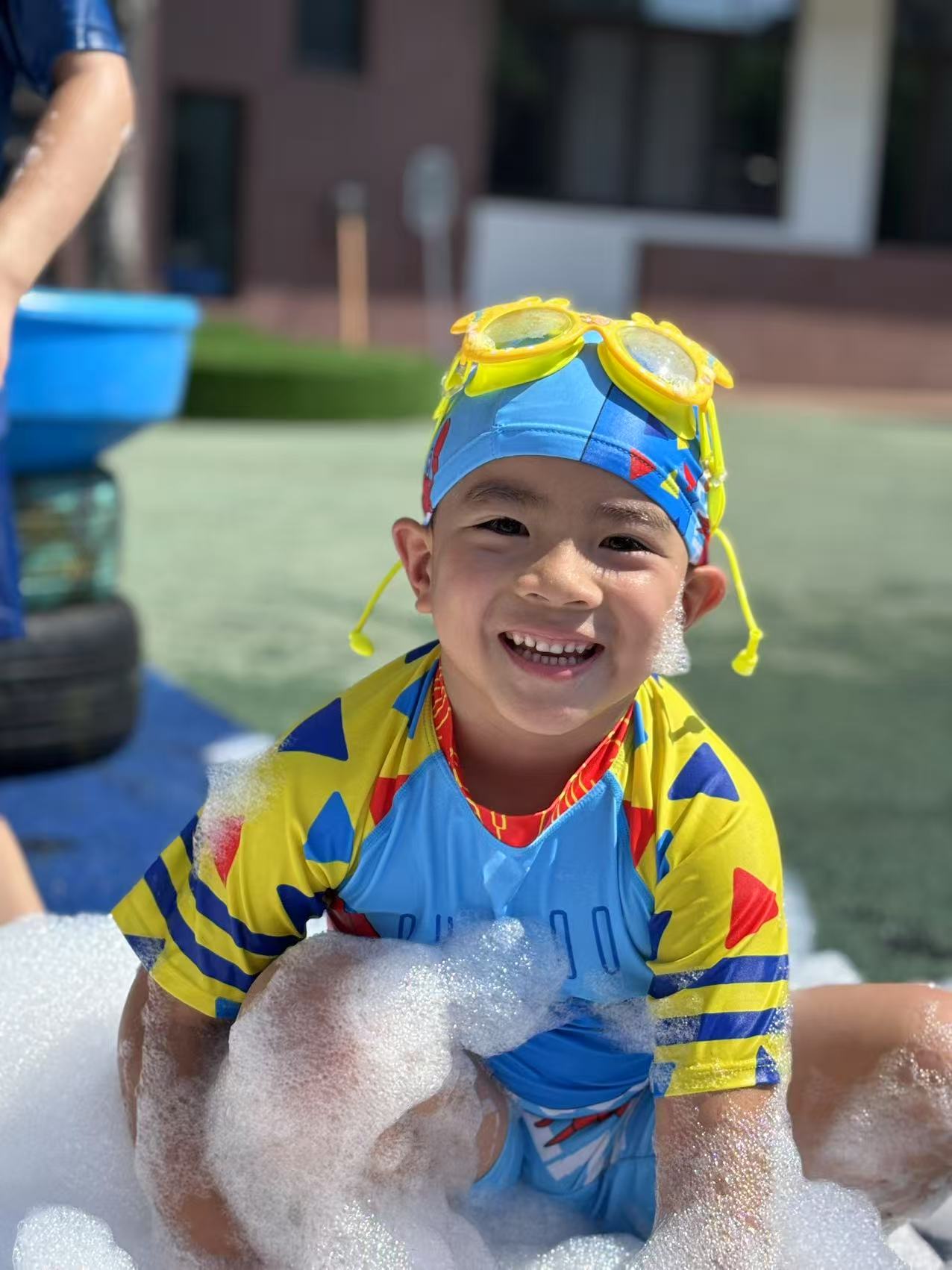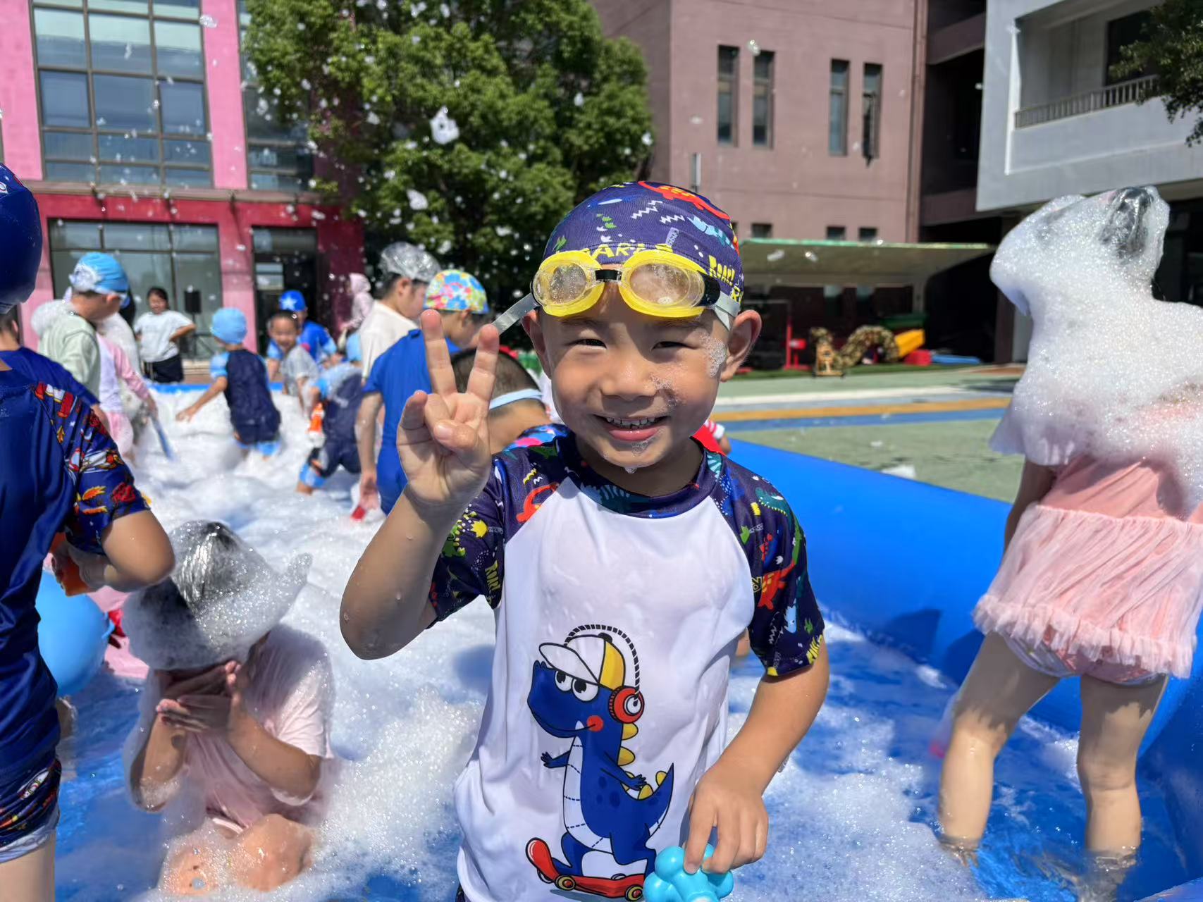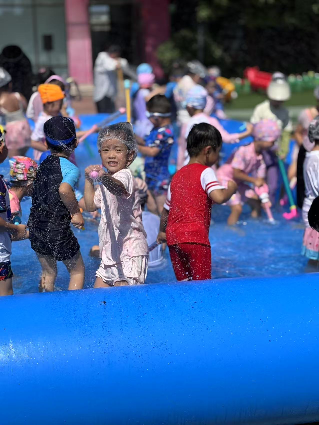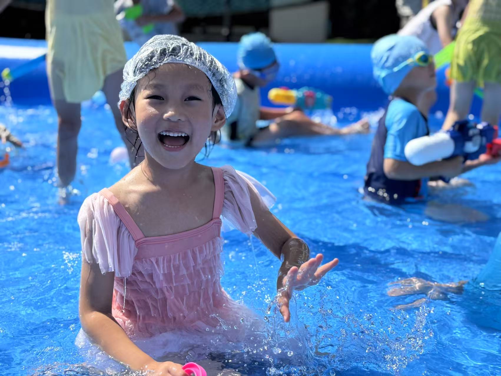 一串串水柱喷射天空,身穿五彩泳衣的孩子们在操场上奔跑着、嬉闹着,幼儿园瞬间变成了欢乐的水世界。每个孩子的脸上都洋溢着灿烂的笑容,他们尽情享受着炎炎夏日里的这份乐趣。