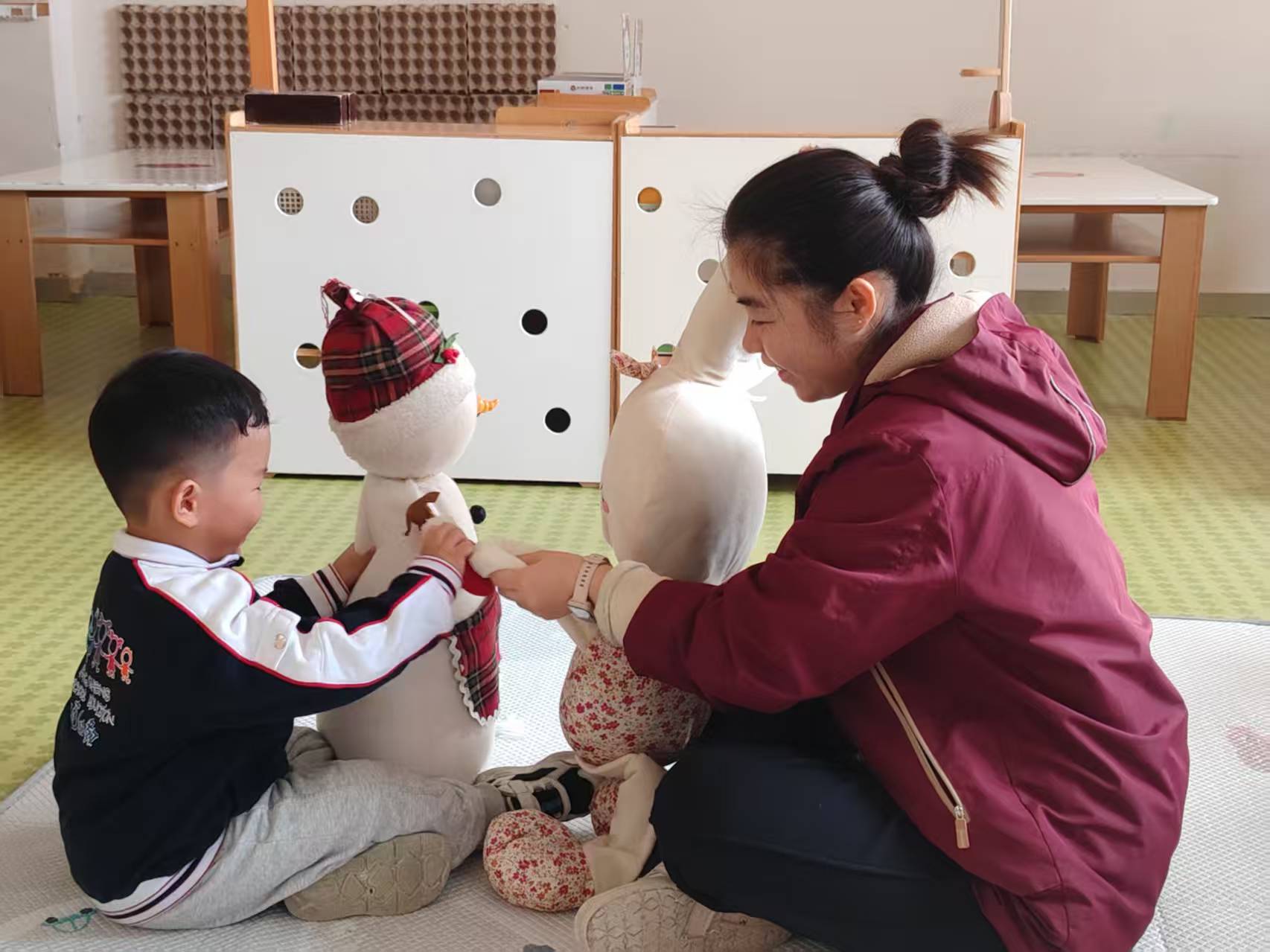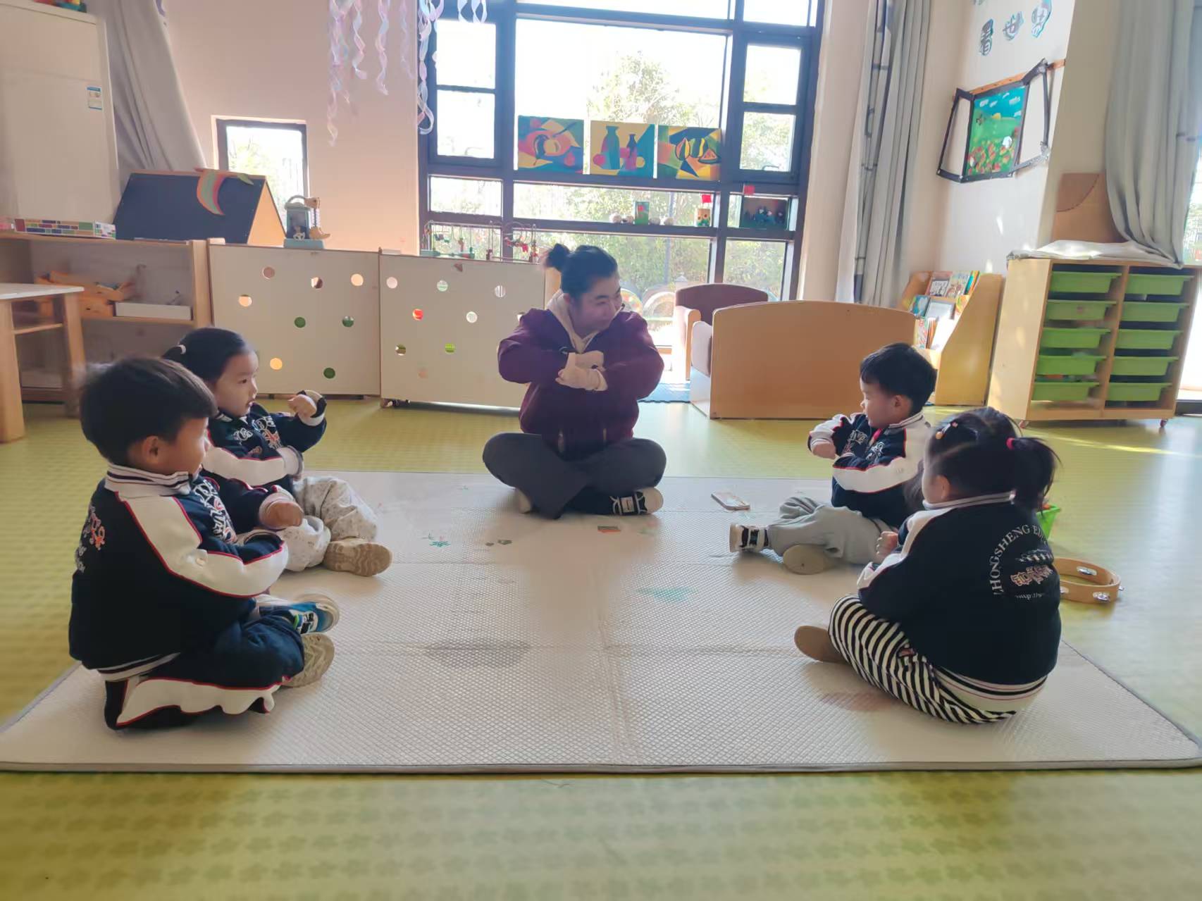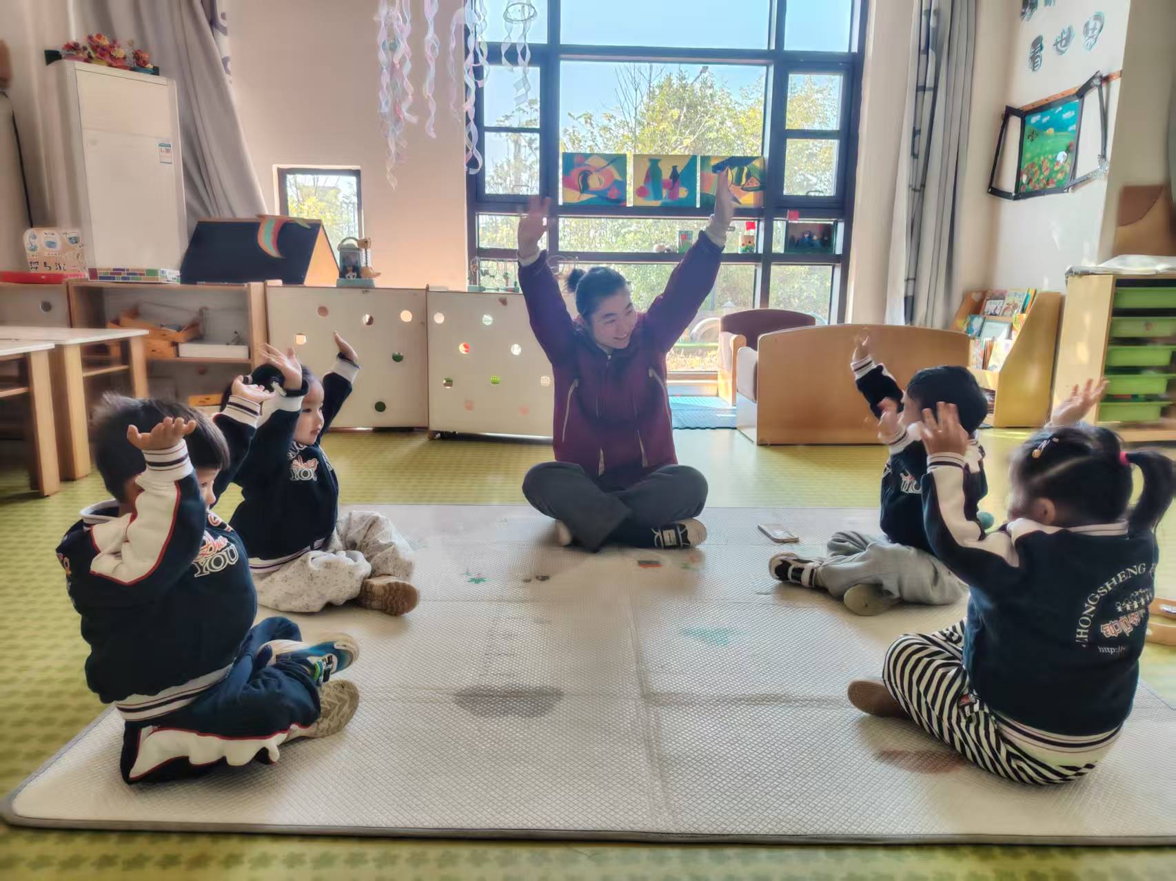 3、打节奏:跟着音乐拍手念一遍,手起,注意间奏时,手不打拍,轻轻摇动身体。(老师对宝宝提示语:摇头),尾奏时继续拍完(老师提示语:继续)
