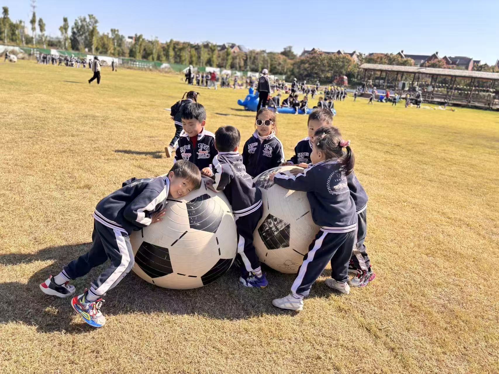 当超大足球滚进草坪,宝贝们立刻化身“小小运动员”,围着足球跑呀、推呀,脸蛋晒得红扑扑,笑声裹着风飘出好远。