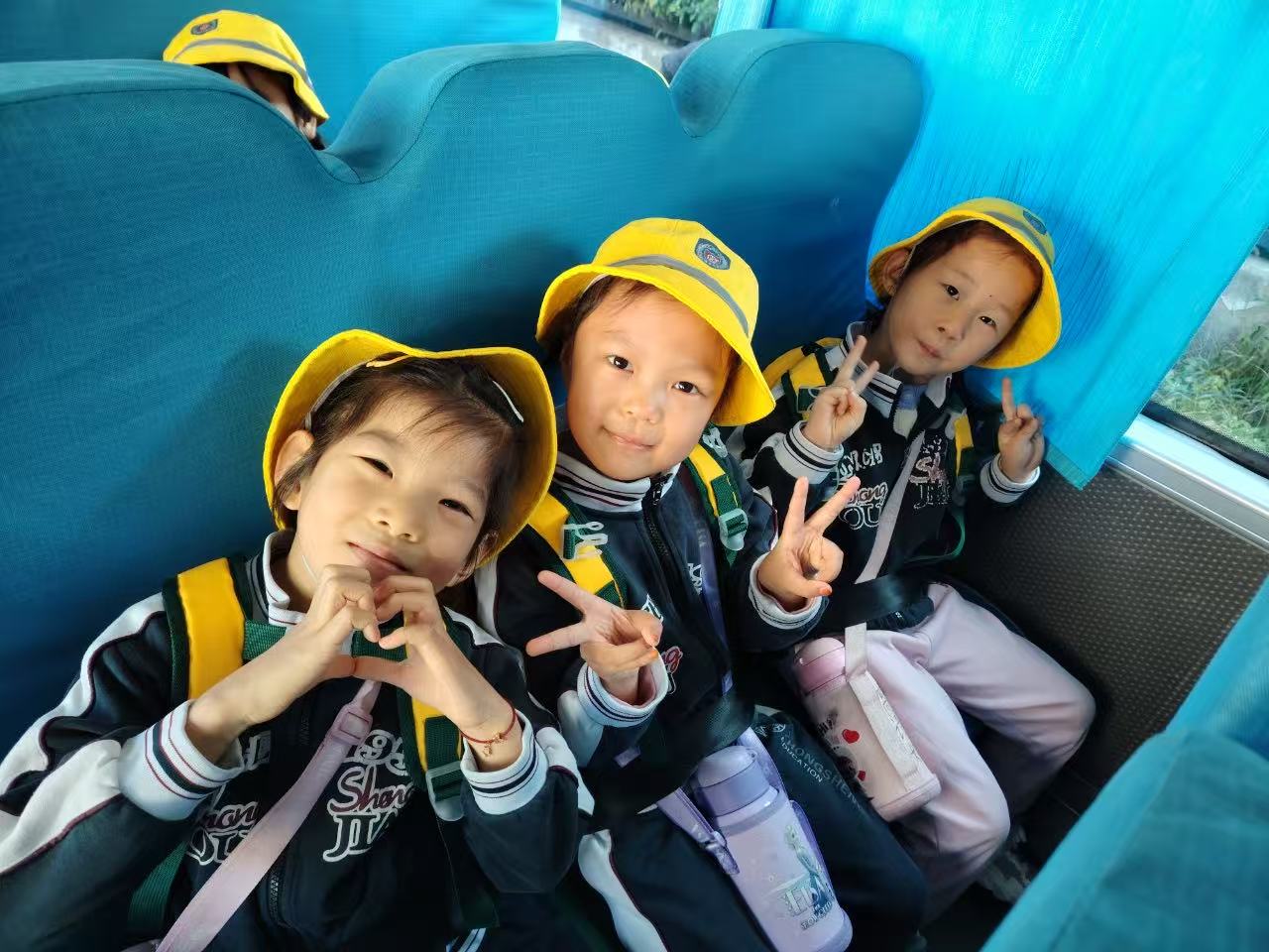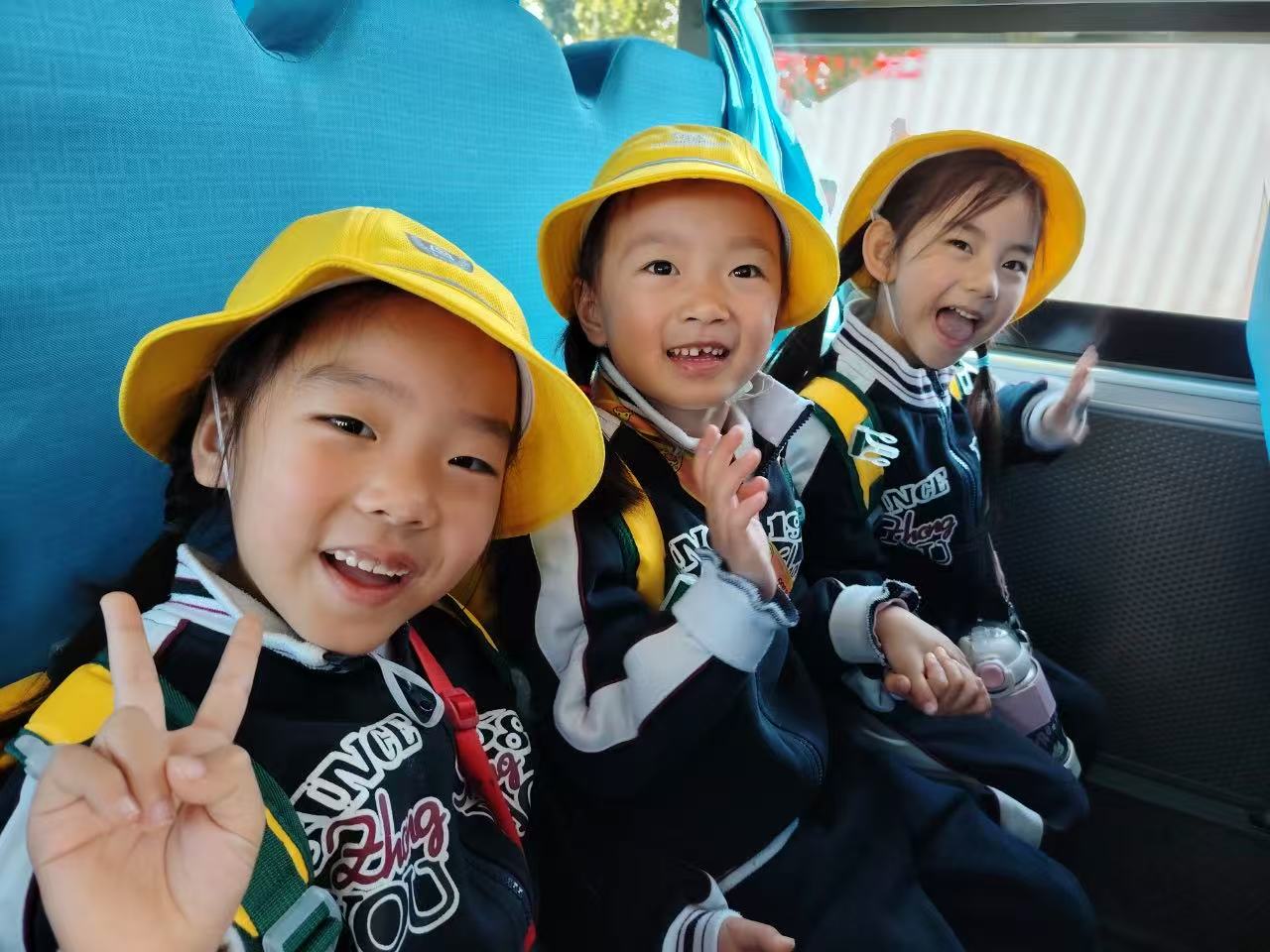 戴着亮黄色小帽子,排着整整齐齐的队伍,宝贝们牵着老师的手钻进校车。车厢里瞬间变成“欢乐小天地”:有人对着镜头比耶笑出小豁牙,有人凑在一起大声唱歌,连风从车窗吹进来,都裹着甜甜的笑声。