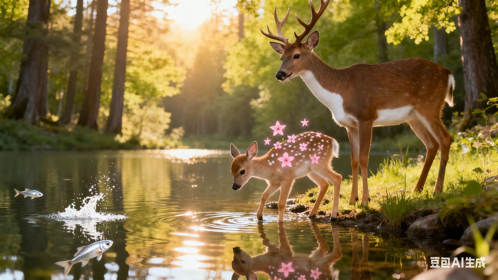 它们来到一个湖边,湖水非常清澈,静得像一面镜子。偶尔有一、两条小鱼跳出水面,溅起一朵朵很美很美的水花。小鹿看呆了。鹿妈妈说:“来,照照看,你是变丑了,还是变美了?" 小鹿小心翼翼地来到水边,仔细打量湖水中的自己。它惊喜地发现自己身上长了几朵若隐若现的梅花。它赶忙回兴问妈妈:“妈妈,我身上是长梅花了吗?” “是的。”小鹿高兴得又蹦又跳,嘴里还不停地喊着:“太好喽,太好喽,我身上终于长梅花喽!我能和妈妈一样漂亮喽!"