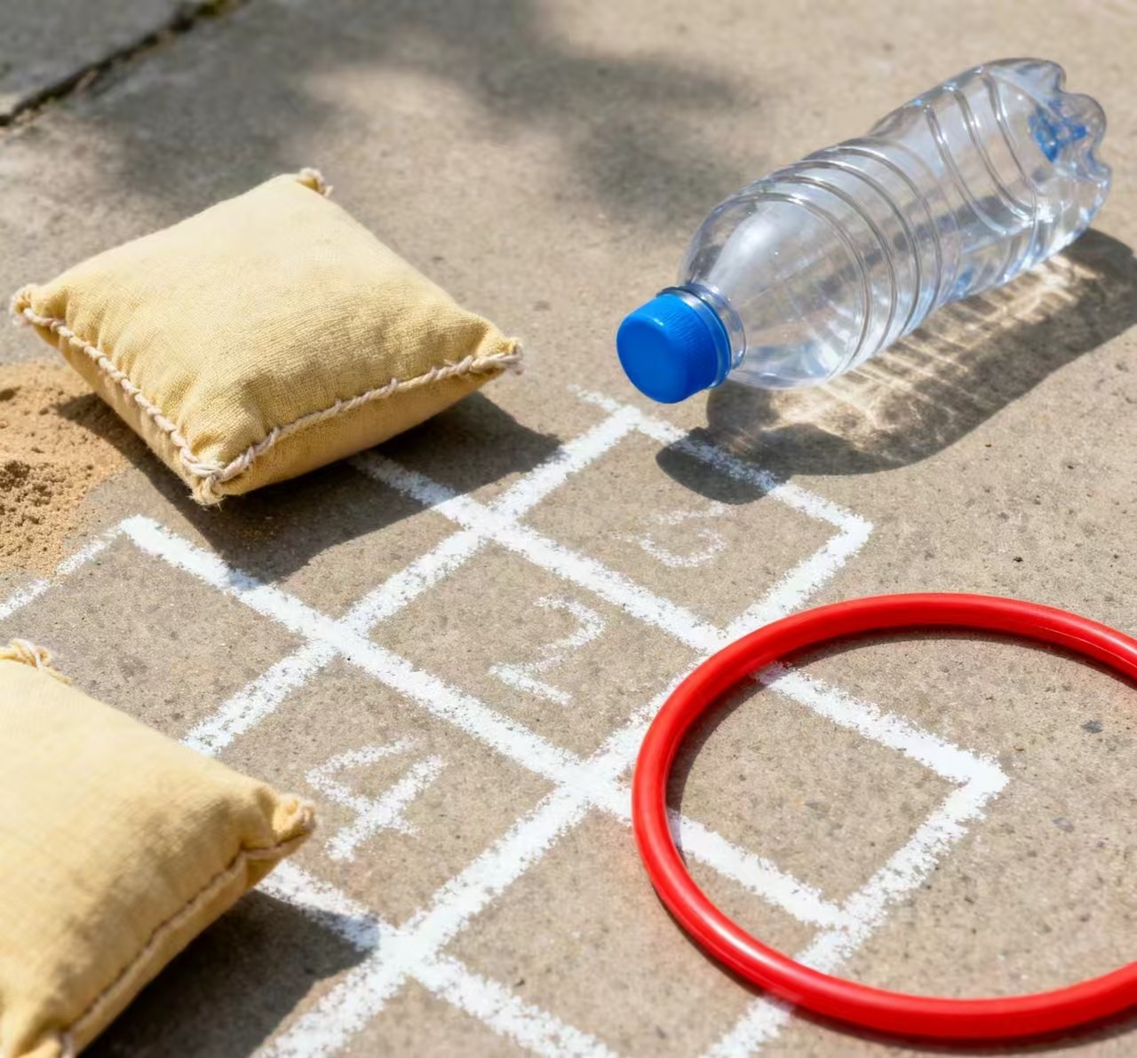 用空塑料瓶摆成球瓶阵,用沙包去滚动击倒它们,考验幼儿的投掷准度和力量控制。