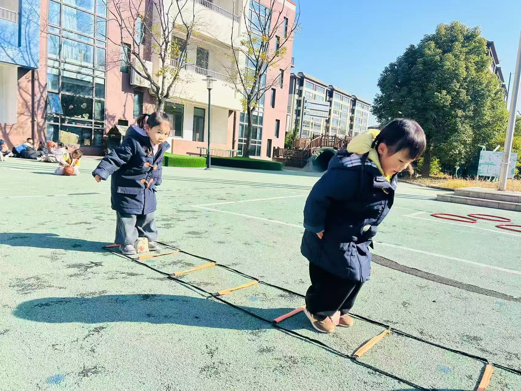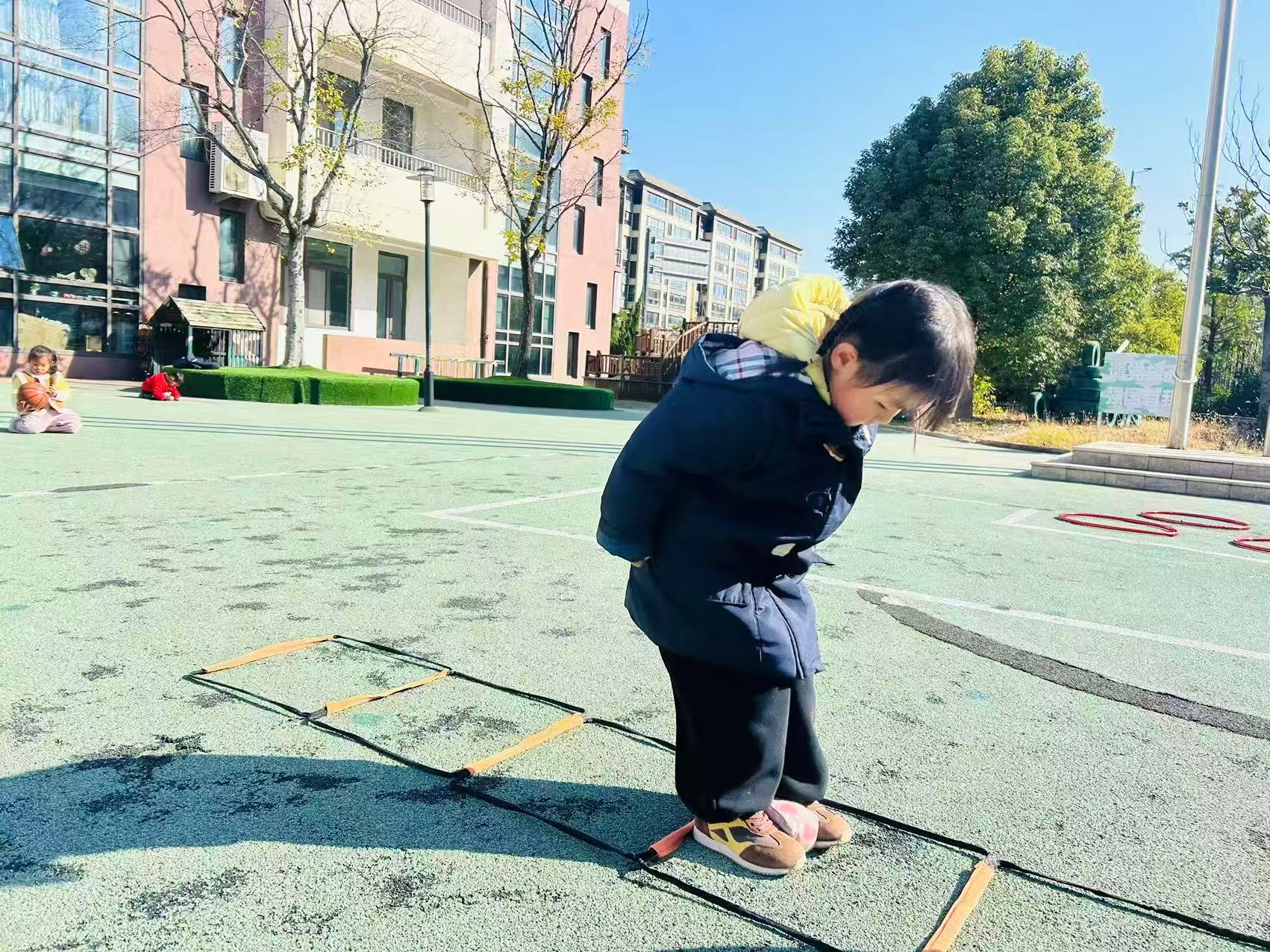 幼儿用双脚夹住沙包跳进格子,一开始间距拉大,幼儿能力提升后增加难度,例如多名幼儿同时有序夹沙包向前跳并不能踩到前面幼儿,可锻炼幼儿的协调性和集体合作游戏意识。