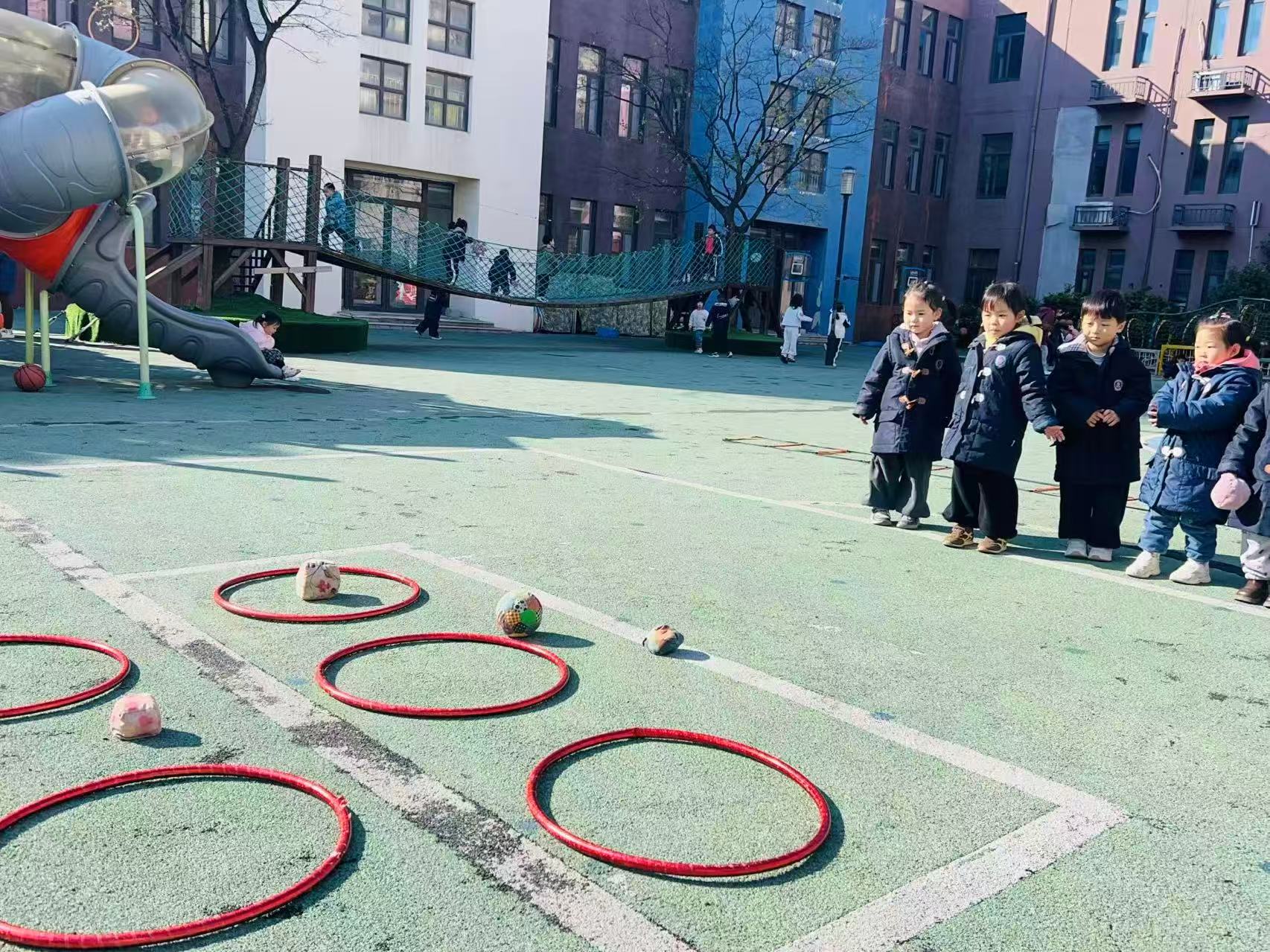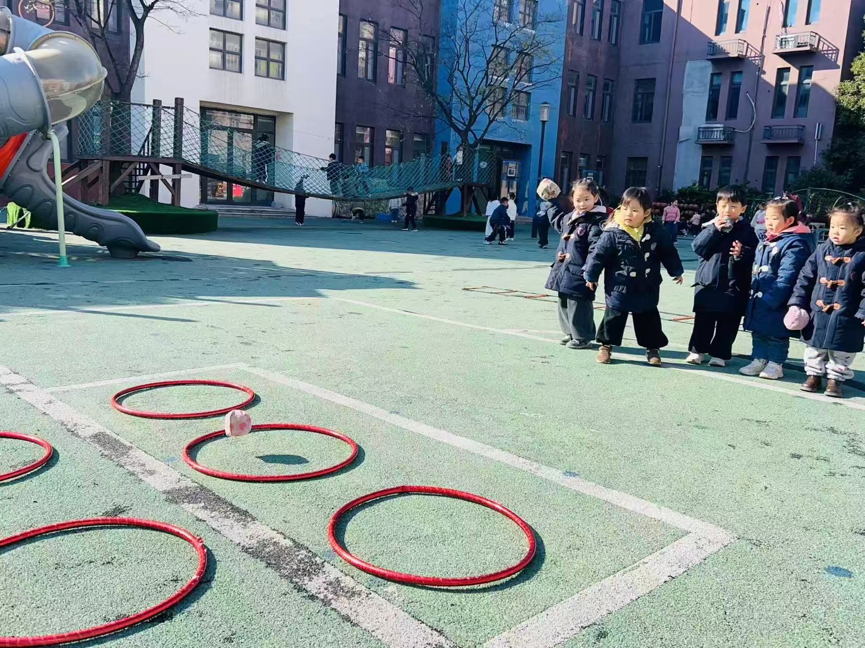物品准备:沙包、塑料瓶、跳格子、红色塑圈。