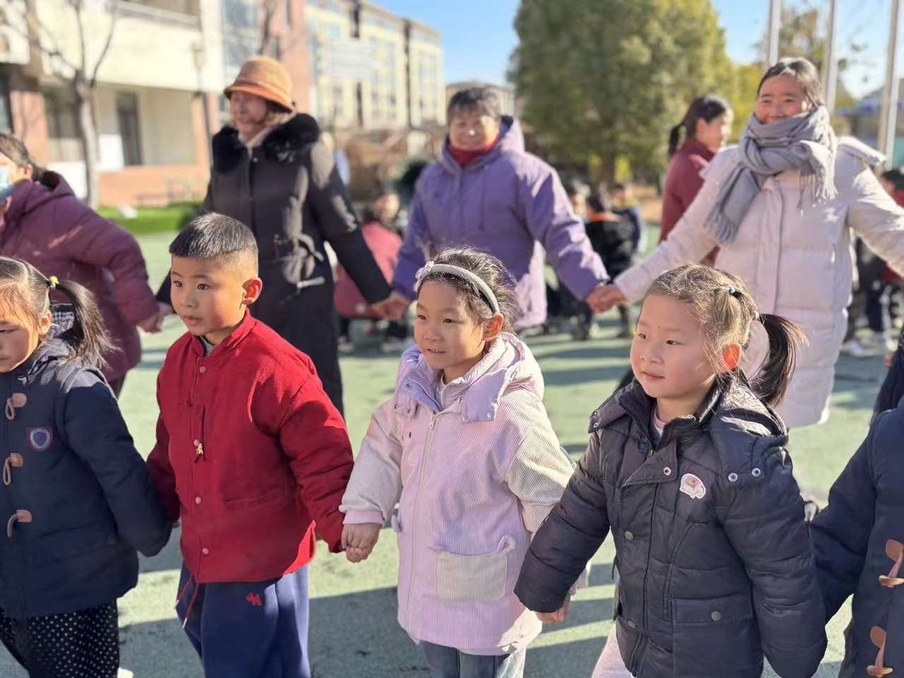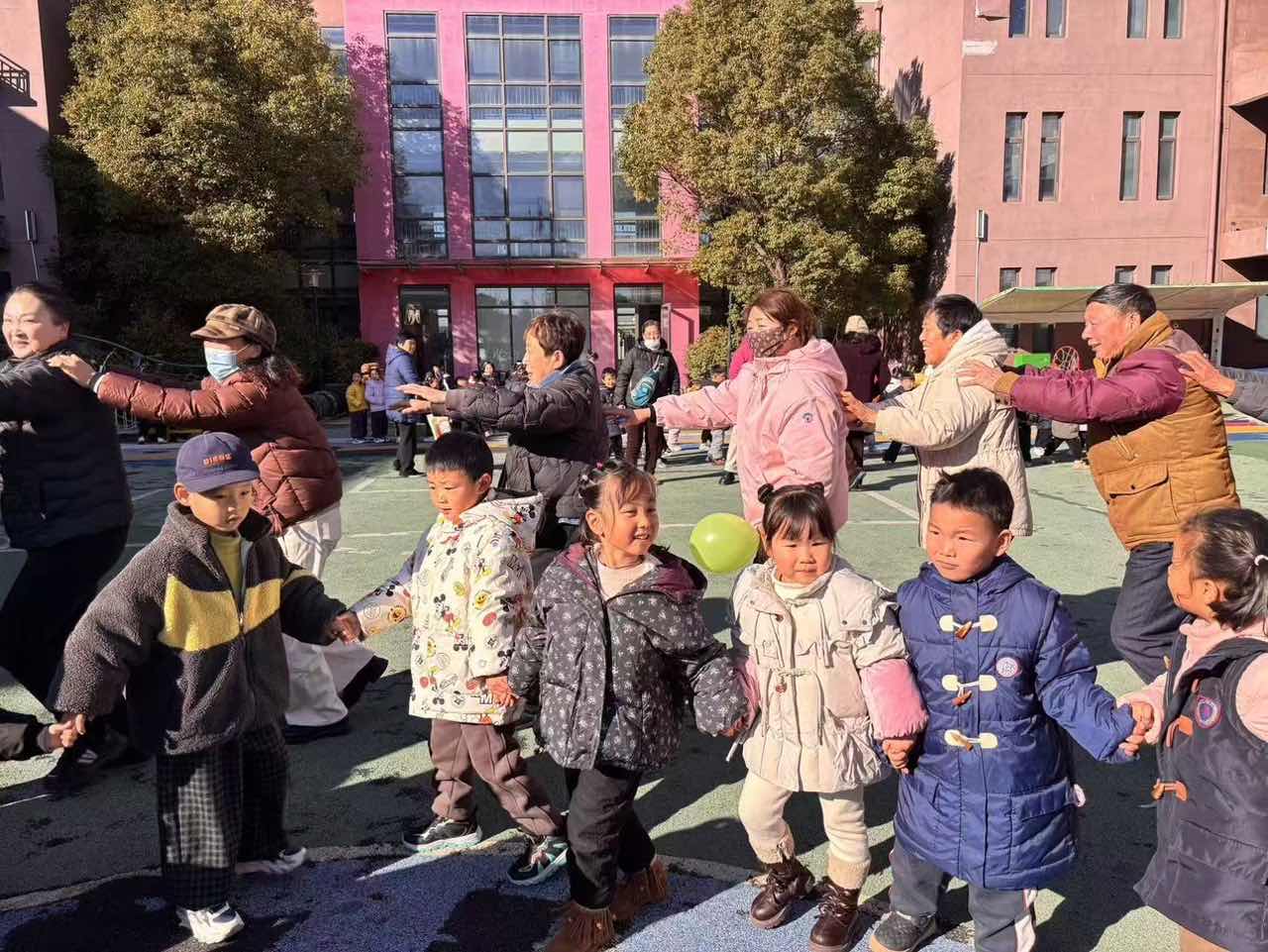 合唱结束后,孩子们牵着爷爷奶奶的手,蹦蹦跳跳地来到户外操场,开启趣味亲子游戏时光。阳光下,爷爷奶奶们仿佛也回到了童年,跟着孩子一起跑跳、欢笑。大手紧紧握着小手,每一个奔跑的身影、每一张灿烂的笑脸,都定格成了亲子间最温暖的画面。