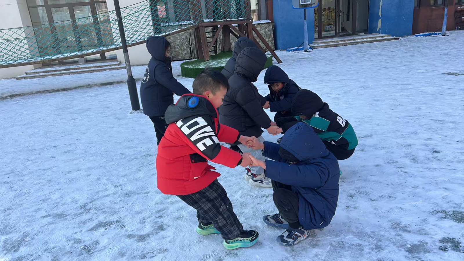 玩法:在平整冰面缓慢滑行,手拉手保持平衡,教师全程看护。