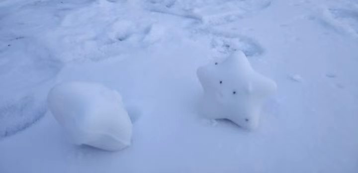 玩法:用模具夹压实积雪,脱模组合成雪人和星星,根据自己喜好添加小装饰。