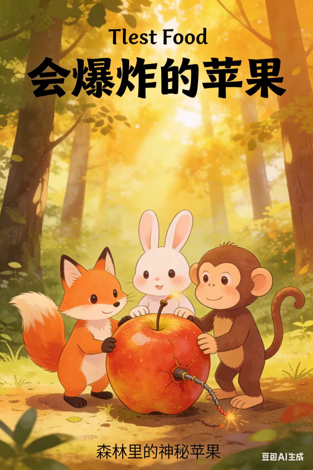 不一会儿,一只小兔子蹦蹦跳跳地走了过来。它看到了地上的苹果,高兴地说:“哇,好大的苹果呀!一定很甜。”小兔子刚要咬苹果,小狐狸突然跳了出来,大声说:“别吃!这个苹果会爆炸!”小兔子吓得连忙扔下苹果,跑回了家。