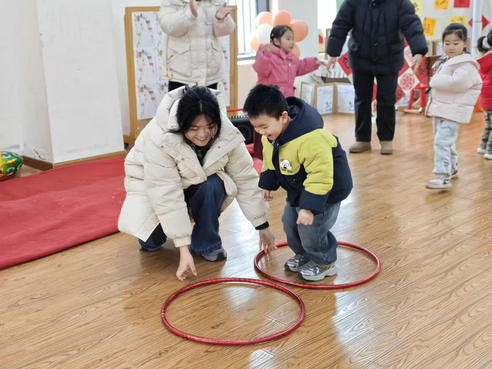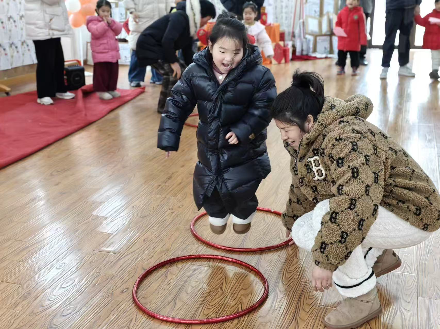 游戏时间到啦!宝贝们和爸爸妈妈、爷爷奶奶一起,化身成最默契的搭档。在“运气球”的游戏里,大家紧紧相拥,小心翼翼地守护着代表快乐的气球,在欢声笑语中感受着合作的乐趣;在“跳圈圈”的挑战中,宝贝们勇敢地向前跳跃,身后是家人温暖的鼓励和守护的目光。