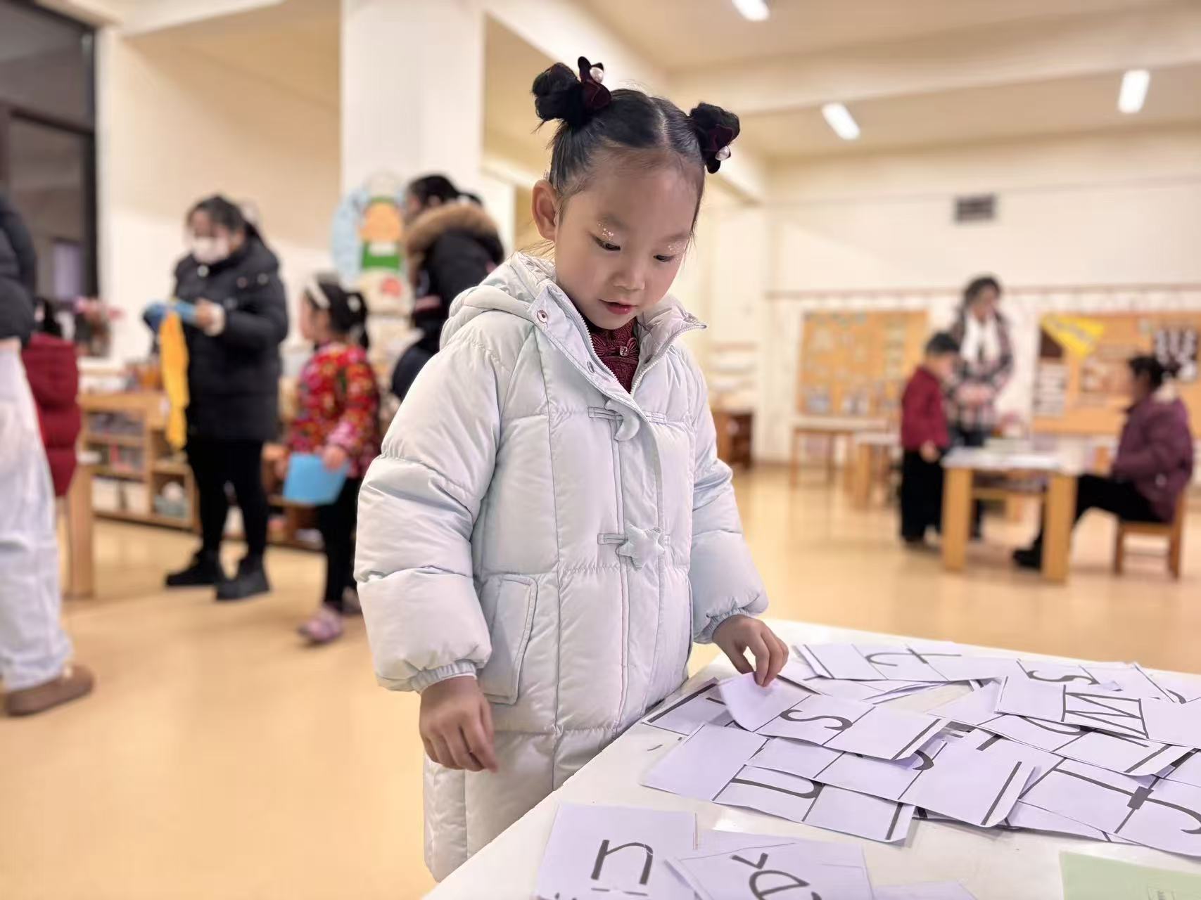 在字母卡片间寻找规律,认读汉字、拼读词语。小手翻动卡片,眼神明亮又坚定,每一次准确的认读,都是语言能力的小小飞跃。认真完成数学闯关题,在图形与数字间思考、计算。从数的分解到简单运算,每一次落笔,都见证着逻辑思维的成长。