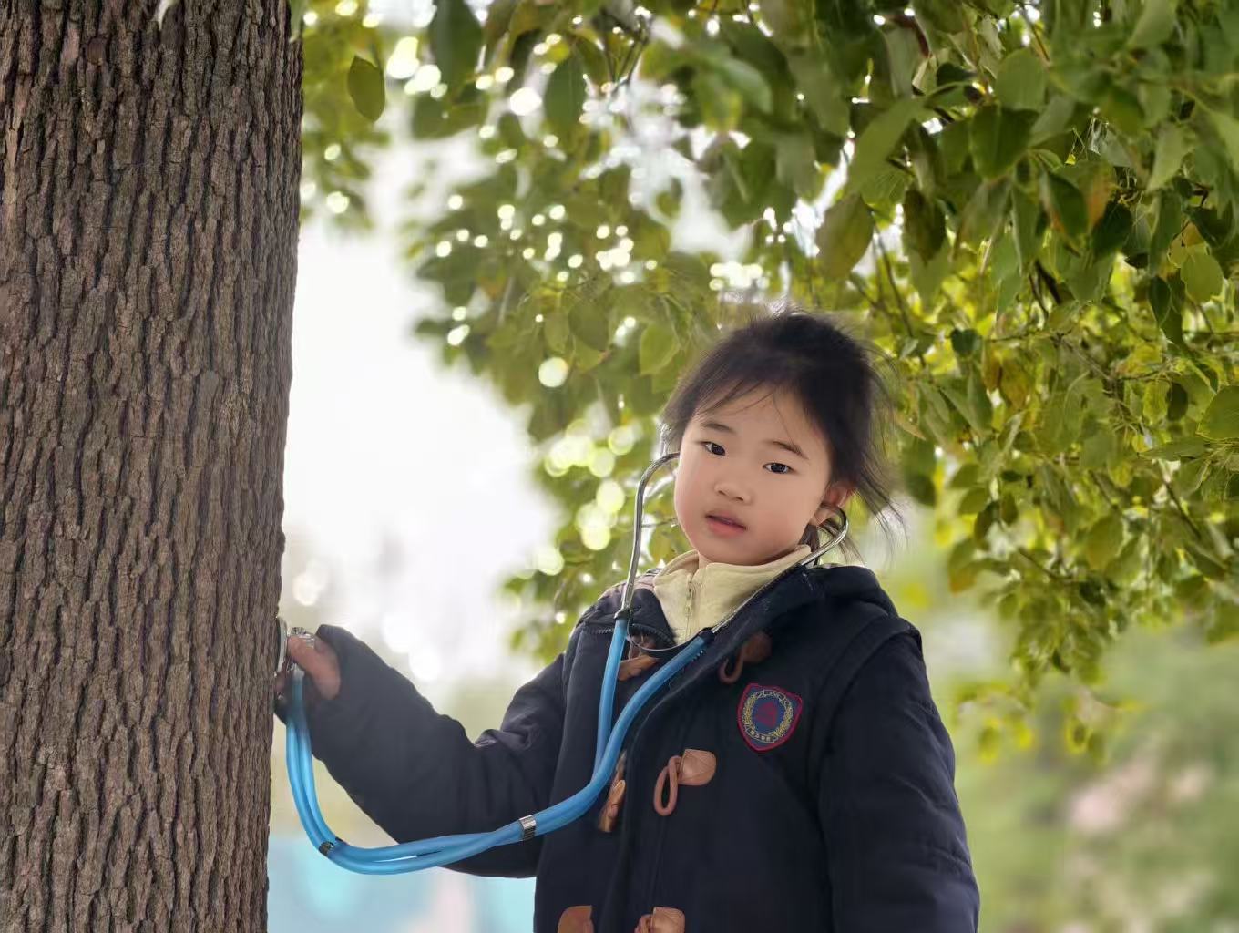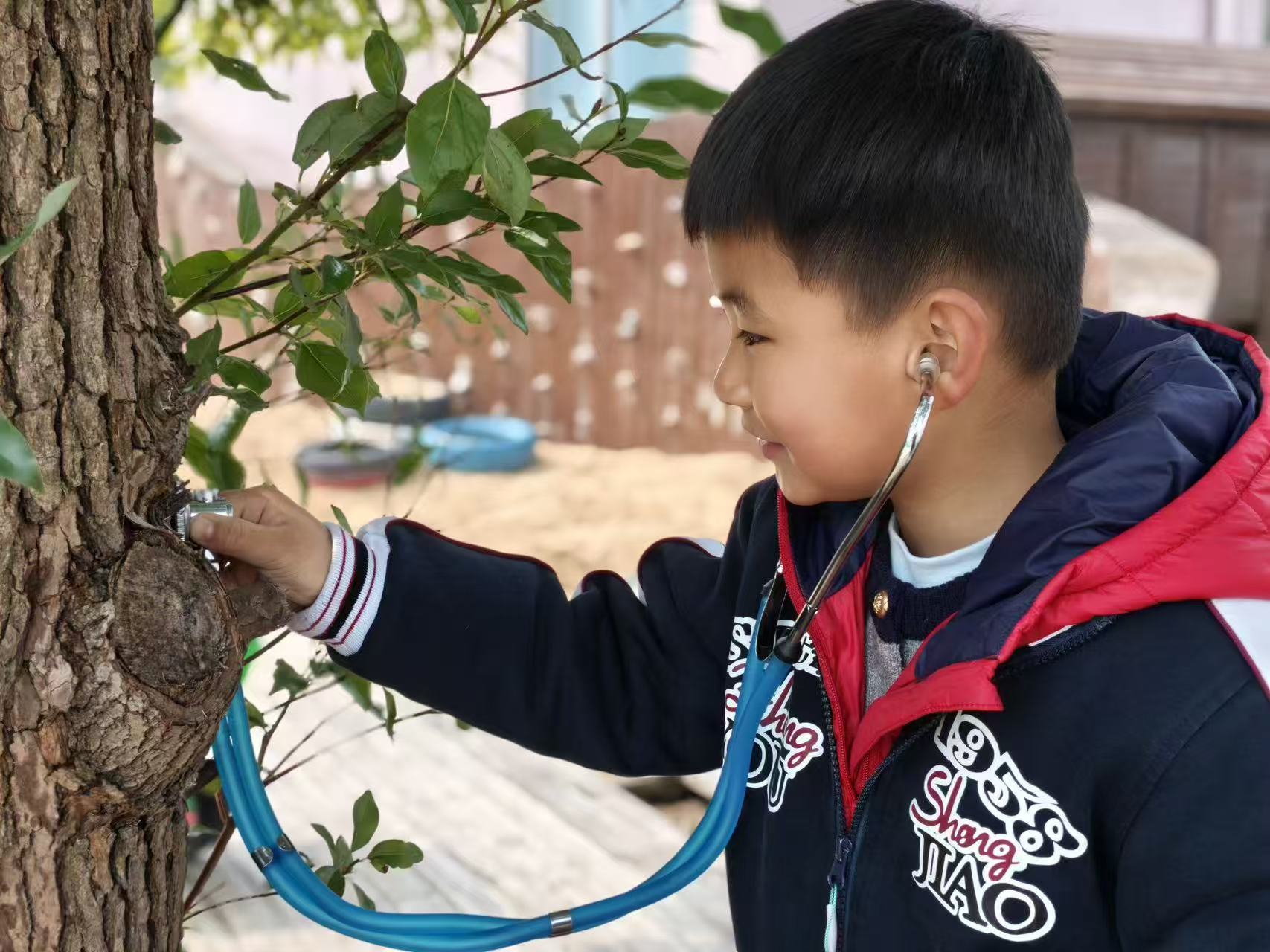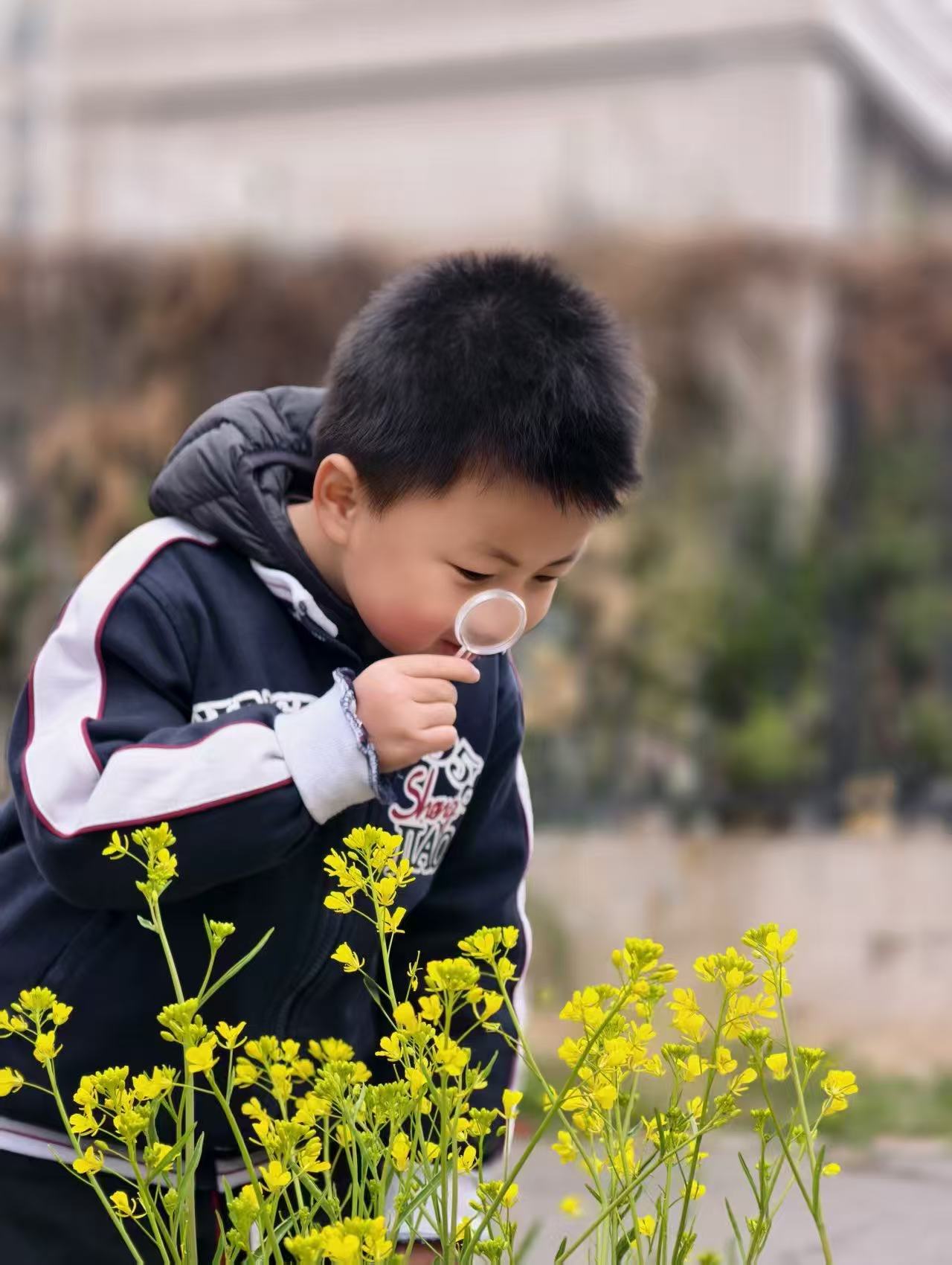 孩子们化身自然小侦探,带着听诊器认真“倾听”大树的心跳,举着放大镜仔细观察油菜花的纹路,蹲在泥土边收集掉落的树叶。他们蹲在树下,和小草说话,和春风握手,把对世界的好奇,都藏进了这一场温柔的探索里。