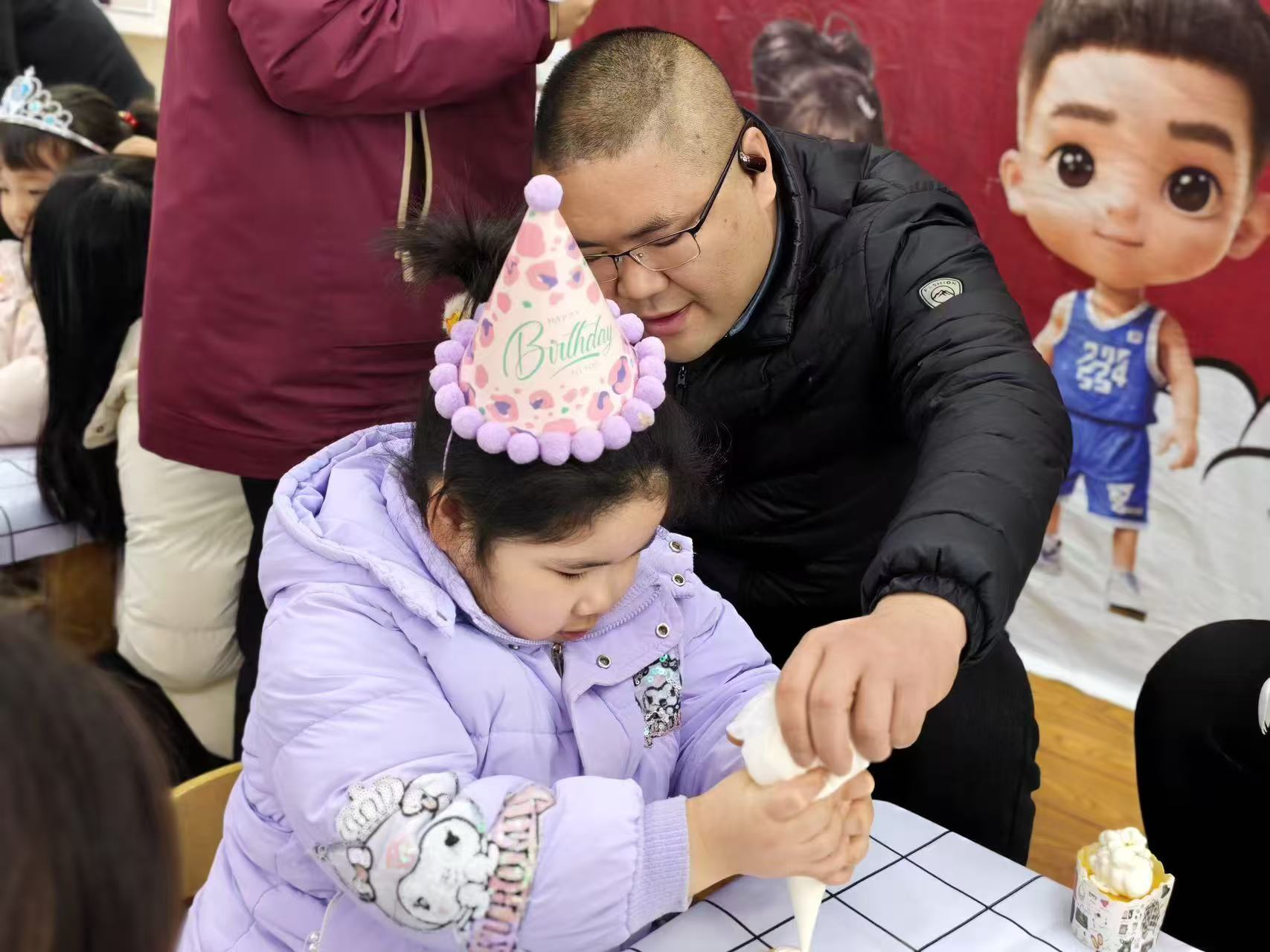 回到教室,孩子们化身小小烘焙师,在家长和老师的陪伴下,亲手为自己制作生日蛋糕。挤奶油、放装饰,认真的小模样格外可爱,当带着自己温度的蛋糕诞生时,甜香里满是成长的喜悦与满足。