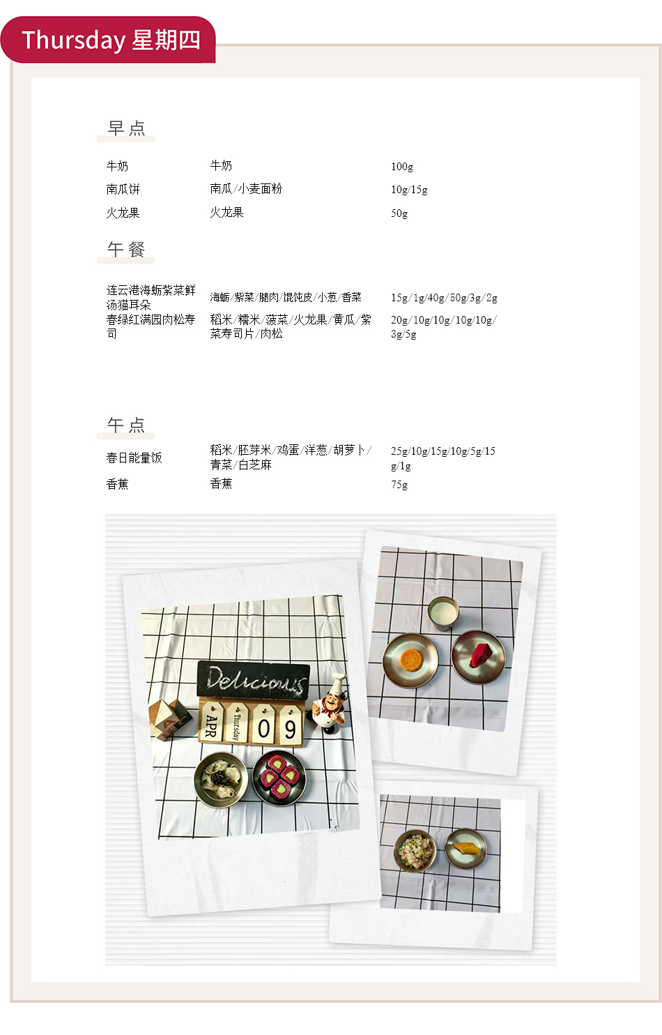 点心:时蔬肉松小饭团、萝卜丝瘦肉粥、春日能量饭、豆腐卷(小巧精致,能量适中,风味多样不重样)
